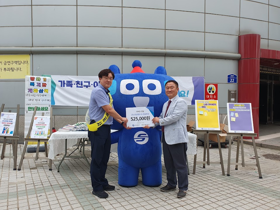 인사캠페인 당일입니다. 전날 늦게까지 준비하느라 몸은 피곤하지만, 정신은 번쩍 깼습니다. 캠페인 시작 전 미리 도착하여 테이블, 현수막을 설치하고 붙임쪽지판을 설치했습니다. 곁에있기 1팀 동료와 함께 고민하며 설치하니 든든했습니다. 인사캠페인이 시작됨과 동시에, 개화산역 기부금 전달식이 있었습니다. 김일배 역장님께서 권순범 관장님께 기부금을 전달해주셨습니다.