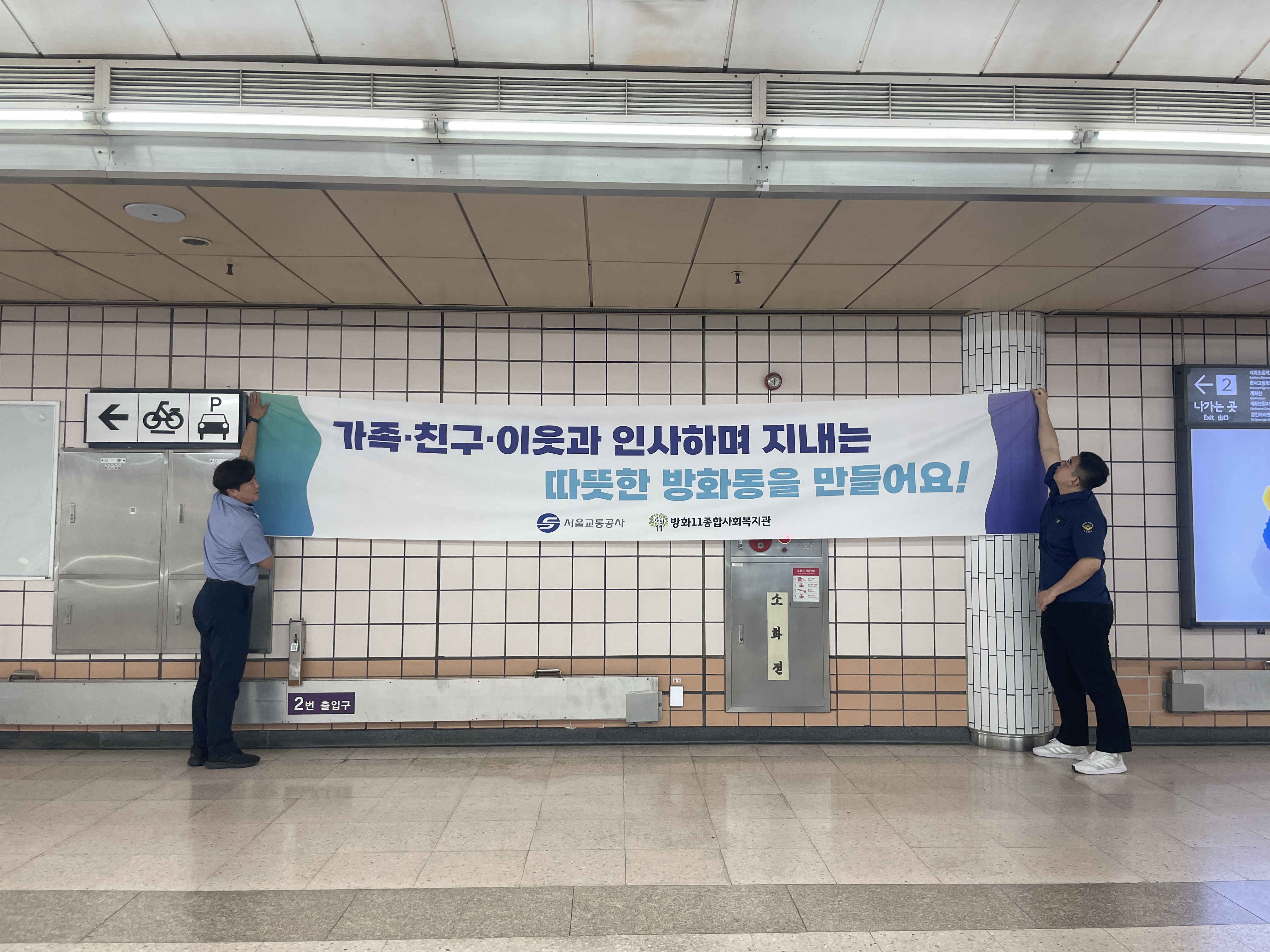 시간이 훌쩍 지나 벌써 인사캠페인이 코앞으로 다가왔습니다. 복지관에서 제작한 현수막, 붙임쪽지판을 공유하고 현수막 위치를 선정하기 위해 개화산역에 한 번 더 방문했습니다. 김일배 역장님께서 현수막을 붙일만 한 위치를 제안해주시고, 눈으로 볼 수 있게 현수막을 들어주셨습니다. 인사캠페인을 적극적으로 도와주심에 고맙습니다.
