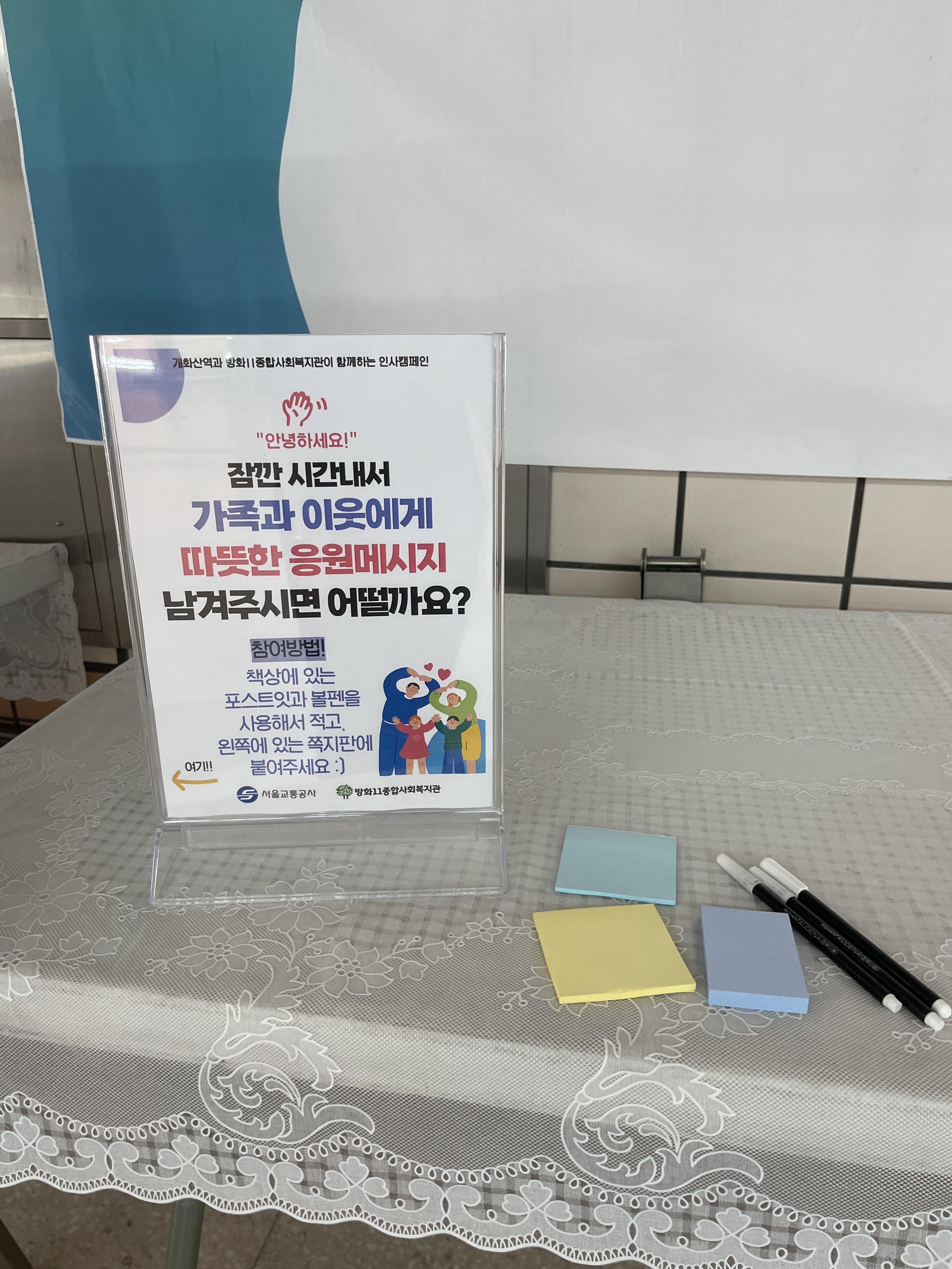 “안녕하세요~ 복지관에서 인사캠페인 하고 있습니다. 가족이나 역무원에게 응원 메시지 남겨주세요!”