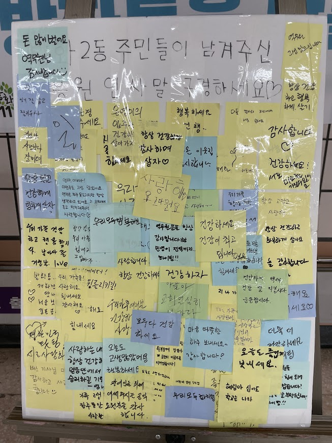 시간이 훌쩍 지나 어느새 인사캠페인을 종료할 시간이 되었습니다. 준비한 붙임쪽지판에 쪽지를 다 붙이고도 자리가 없을 정도로 많은 주민분들이 참여해주셨습니다. 캠페인은 끝났지만, 소중한 인사말들을 주민들과 함께 나누고 싶어 개화산역에 비치했습니다.