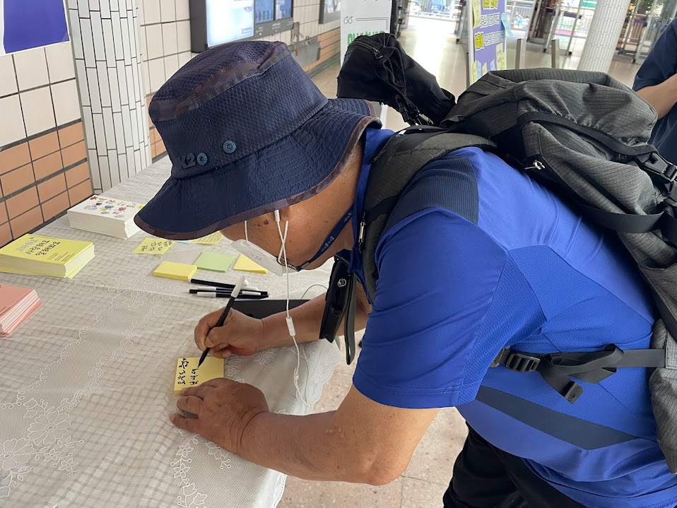 “안녕하세요~ 복지관에서 인사캠페인 하고 있습니다. 가족이나 역무원에게 응원 메시지 남겨주세요!”