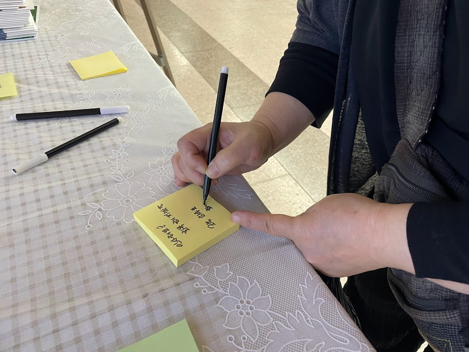점심 캠페인을 마치며 저녁 캠페인을 위해 현수막과 붙임쪽지판을 개화산역 역사 안으로 옮겼습니다. 낮 시간동안 주민분들이 남겨주신 붙임쪽지를 지나다니며 볼 수 있게 하고, 메모지와 펜을 비치하여 주민분들이 참여할 수 있게 제안했습니다.