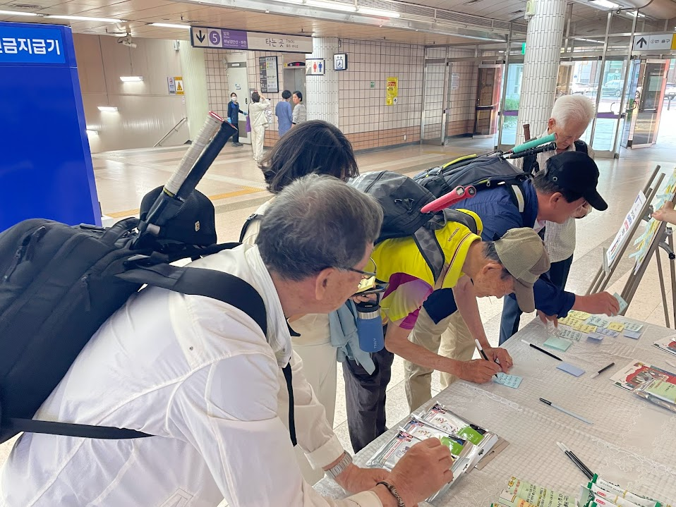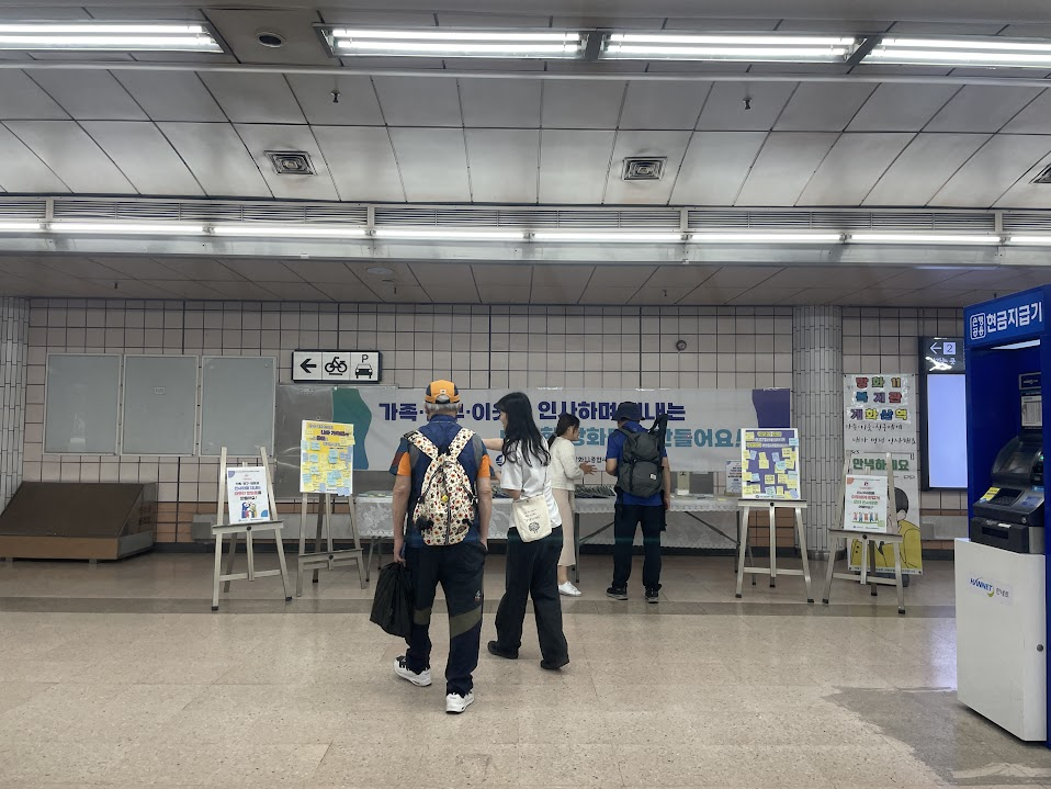 저녁 인사캠페인 시간이 다가오며, 곁에있기 1팀 팀원들과 함께 개화산역에 캠페인 물품을 설치했습니다. 팀원들과 함께 물품을 설치하는 와중에도 몇몇 주민분들께서 캠페인에 관심을 가져주셨습니다.