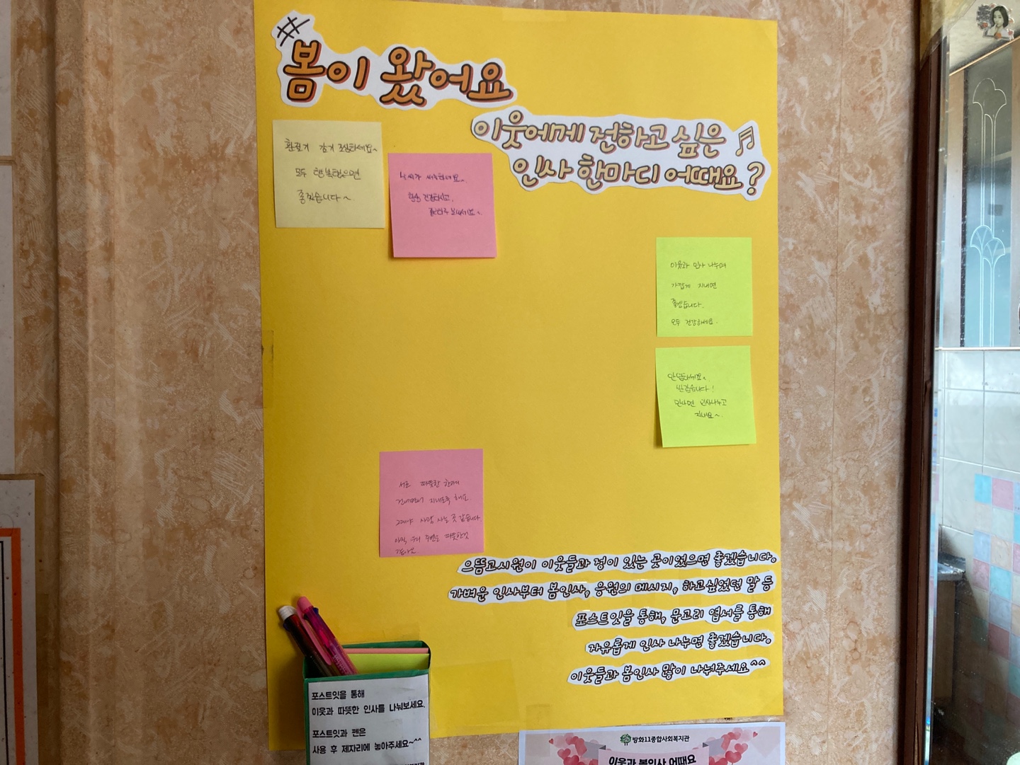 포스트잇과 문고리 엽서를 통해 이웃들과 인사 나눌 수 있는 붙임쪽지판을 공용주방 한쪽에 만들었습니다.