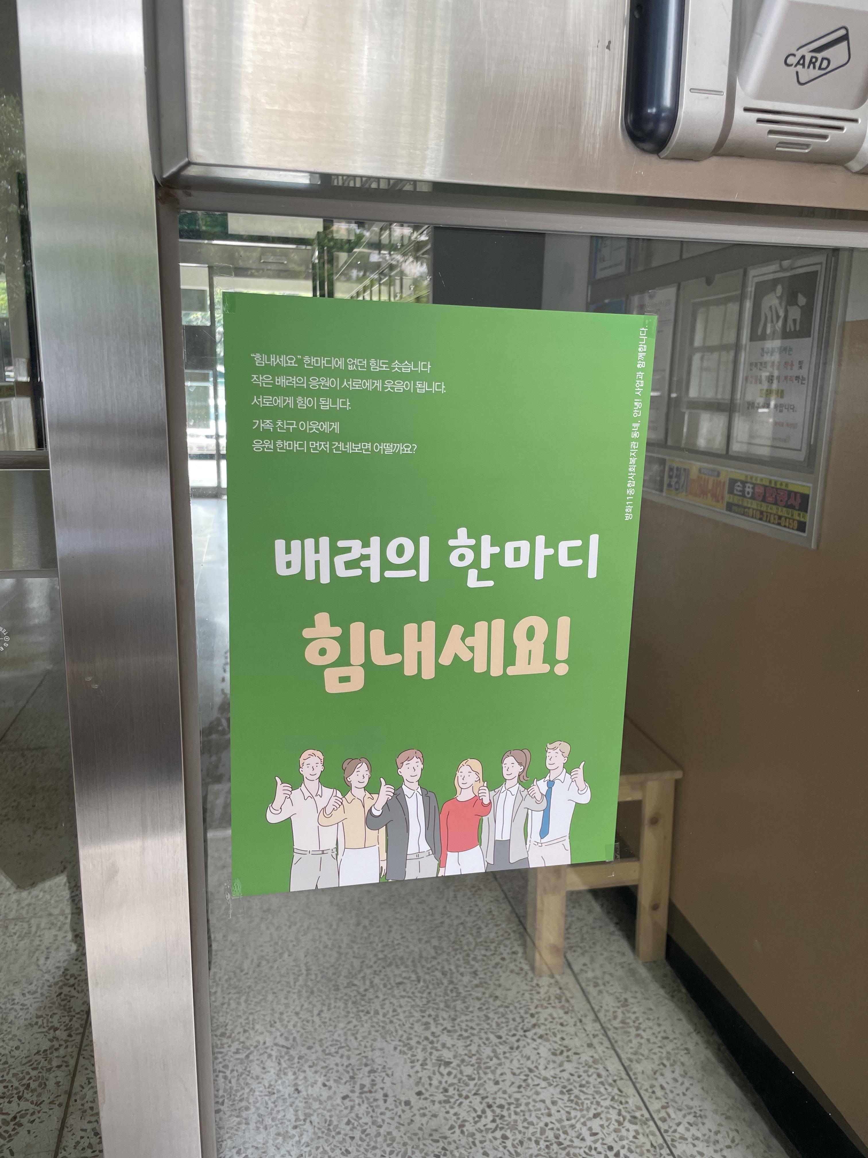 이번 인사캠페인 포스터를 구실로 주민분들이 가족, 친구, 이웃과 "힘내세요!" 인사 많이 나누시기를 소망합니다.
