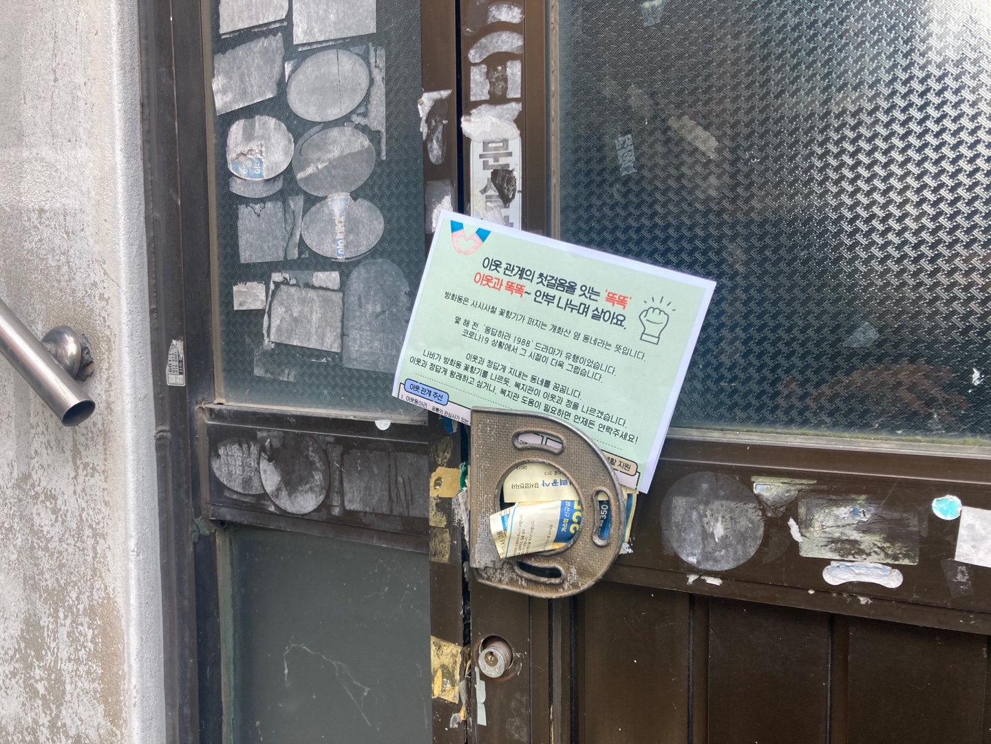 골목 골목에 복지관을 알리기 위한 홍보지와 사회적 고립가구 똑똑 사업 홍보지를 붙이며 동네를 걸었습니다. 만나는 주민들에게는 복지관을 알리는 홍보지와 고립가구 홍보지를 드리며 인사했습니다.