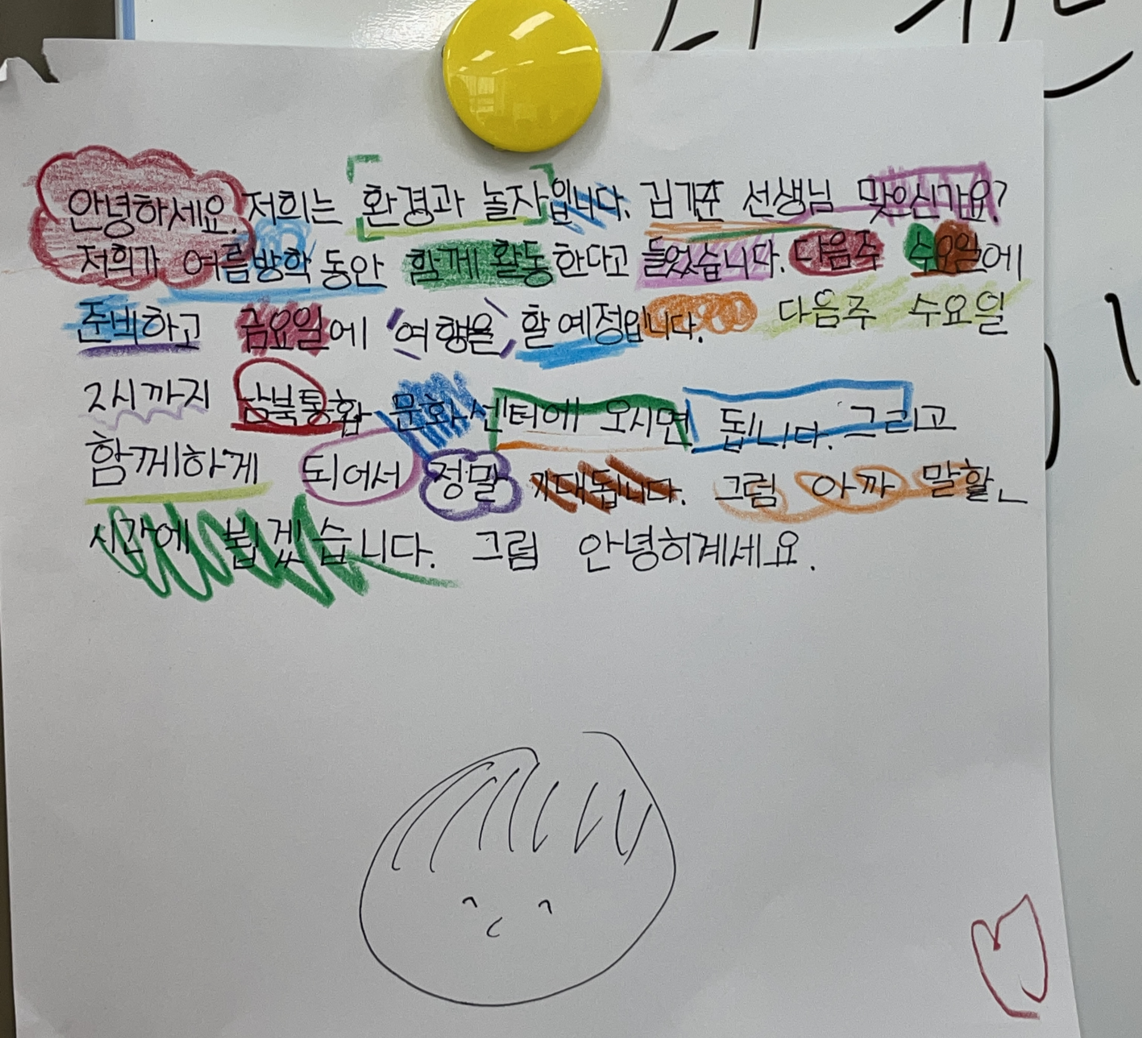 아이들은 두 선생님이 첫 만남에 잘 찾아오실 수 있도록 시간과 장소를 안내했습니다. 기대하는 마음을 전했습니다.
