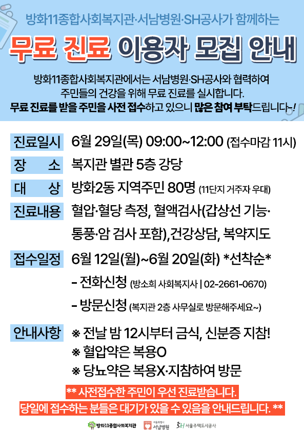 특히, 이번 진료는 SH공사에서 사회공헌활동을 담당하고 있는 소통협력팀에서 함께 협력해 주시기로 하셨습니다. 우리 복지관이 위치한 방화11단지 아파트도 SH공사에서 운영하는 아파트입니다. 이번 진료에 11단지 입주민분들이 많이 참여하시길 바라는 마음으로 11단지 각 동에도 안내지를 부착했습니다.