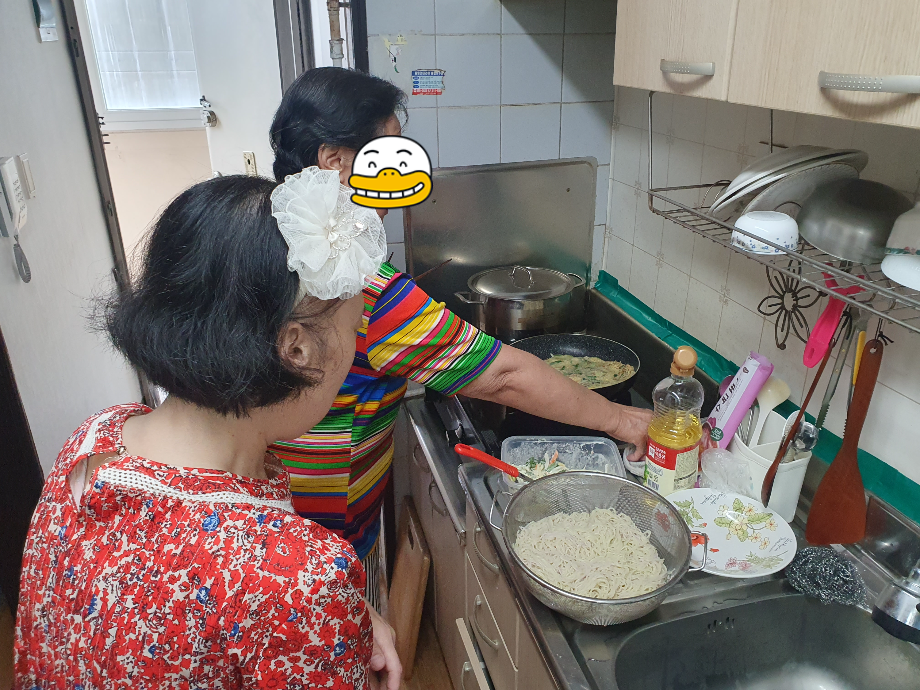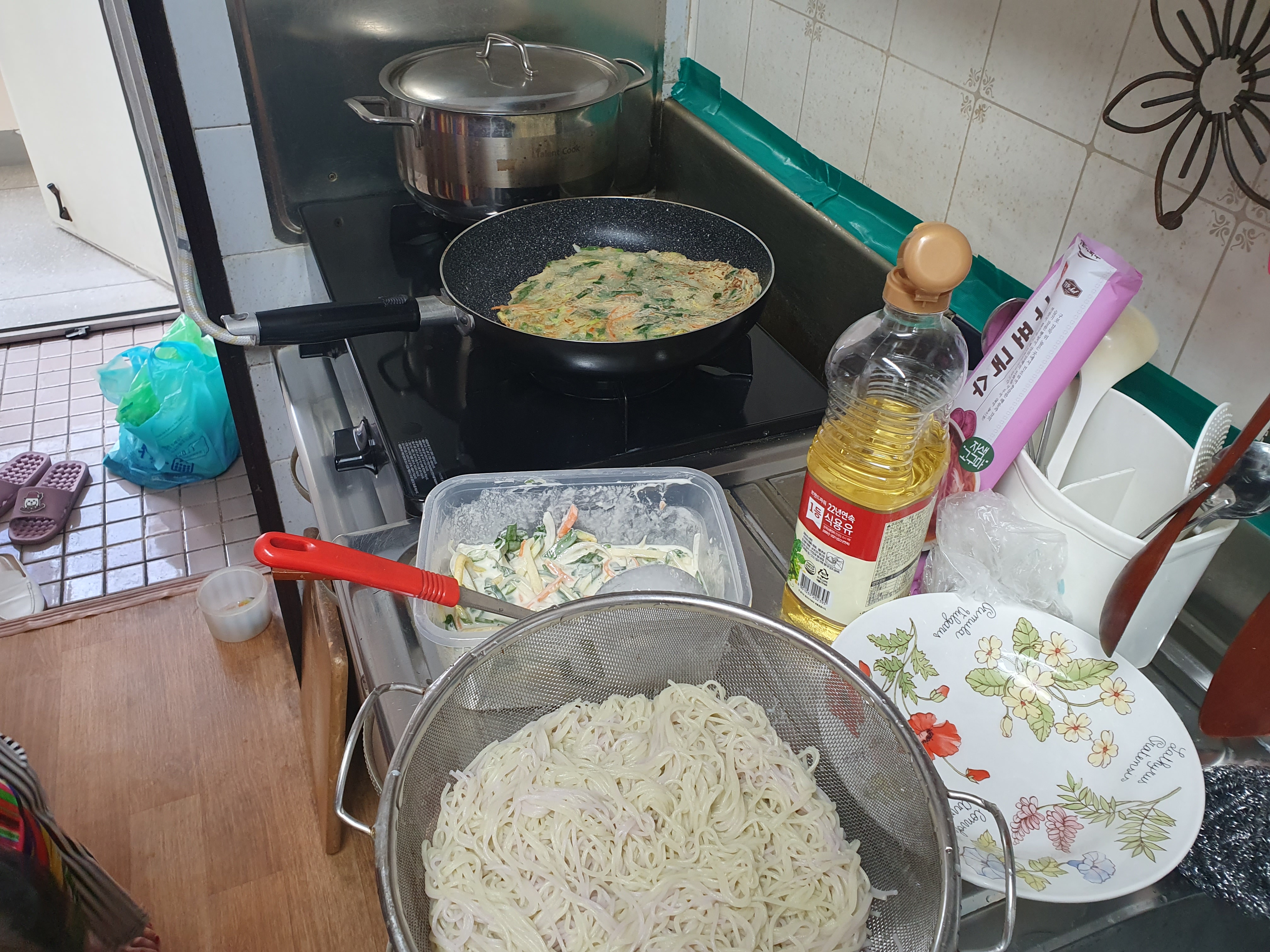 국수와 부침개를 준비하며 맛있는 음식 냄새가 1동에 넘칩니다.