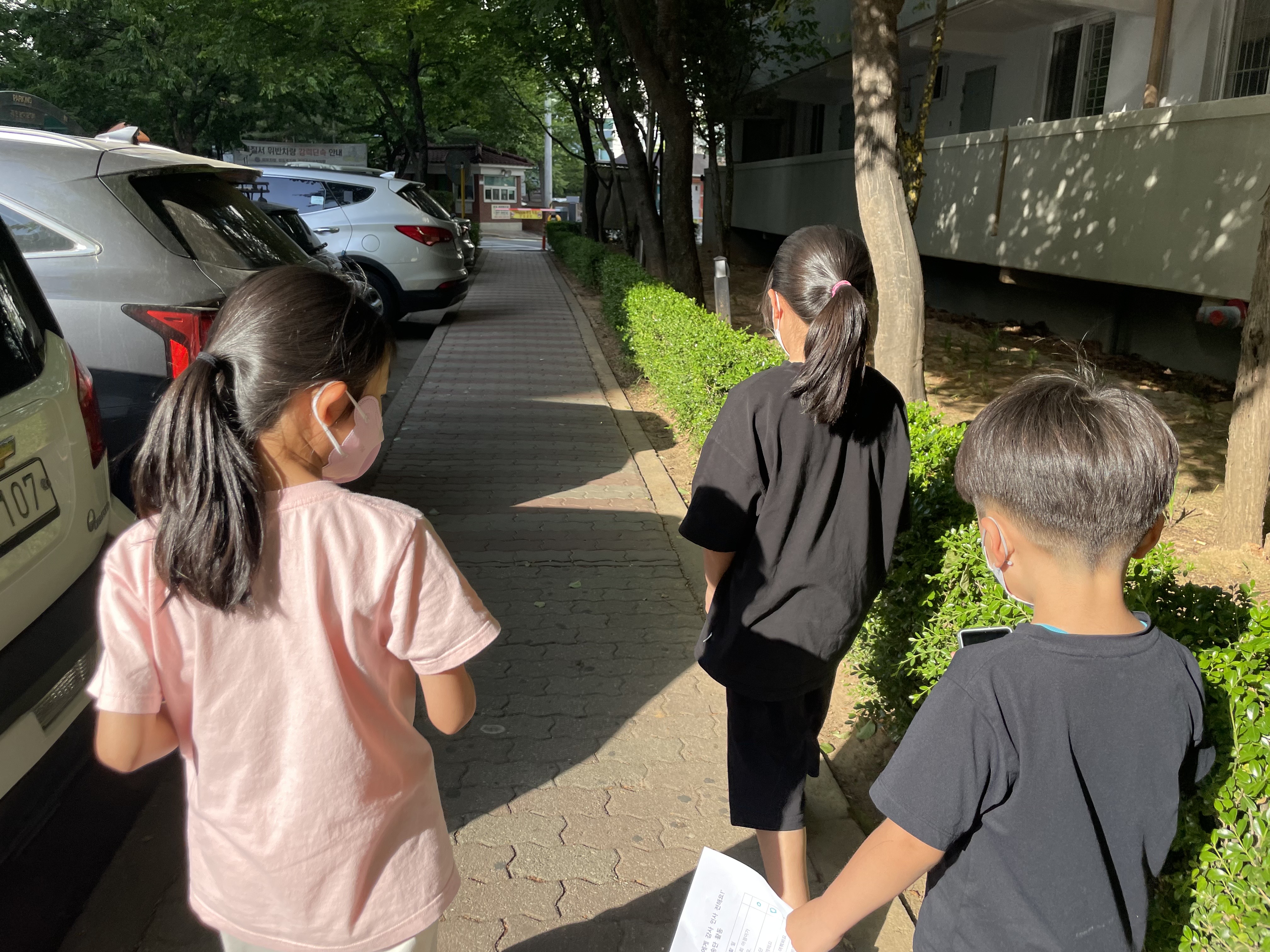 준비를 마치고 관리사무소로 향했습니다. 어떤 길로 갈지 아이들이 직접 정합니다.