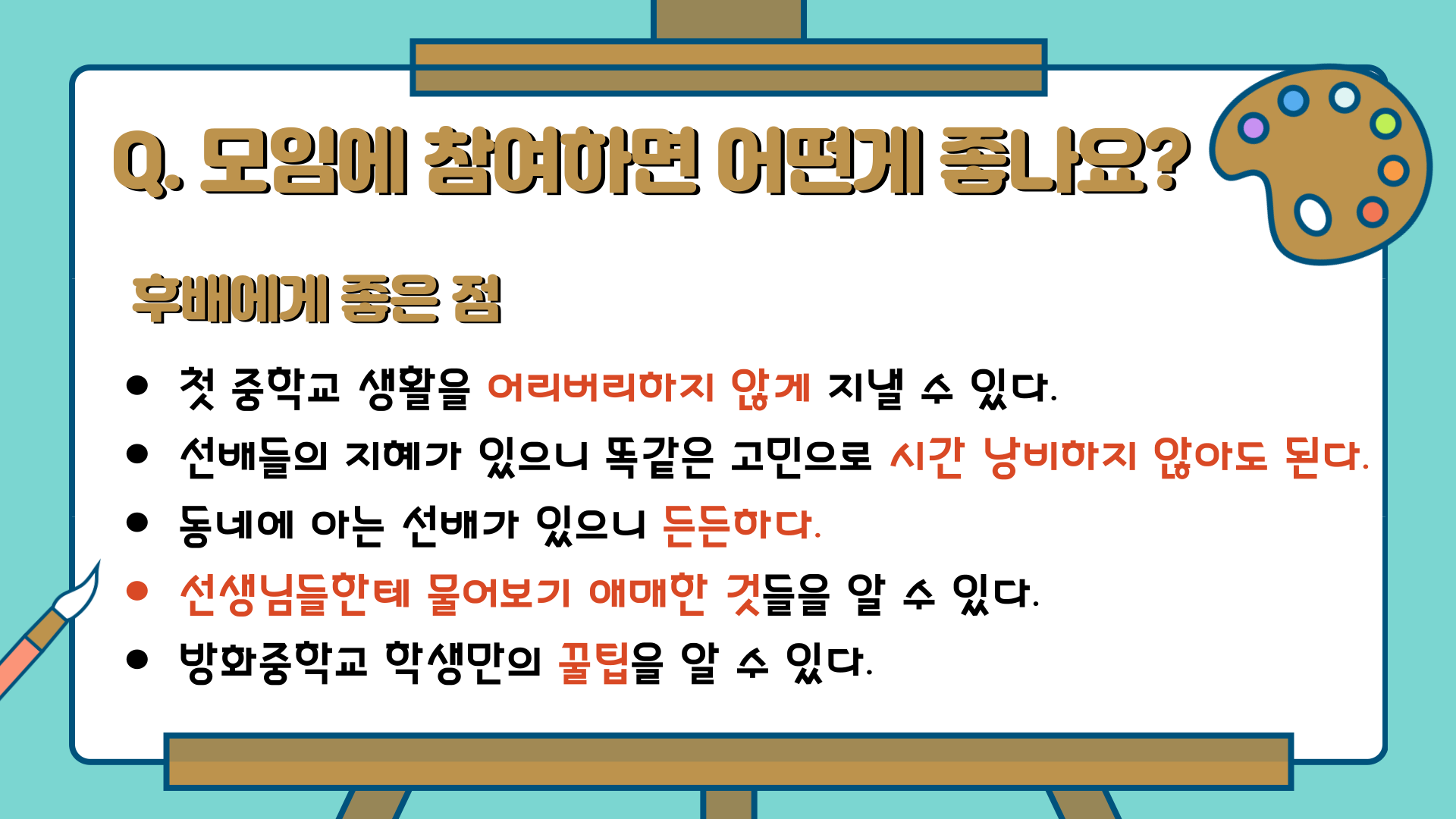 학교에서 후배들의 학교생활 적응을 돕기에 마땅한