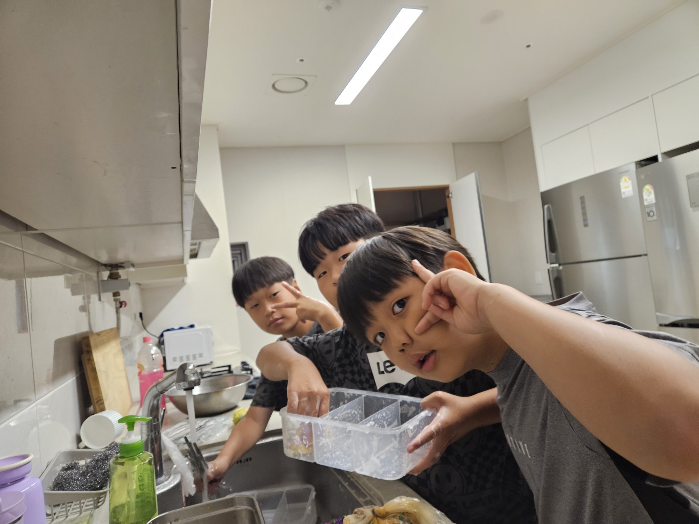 어제 저녁, 오늘 아침과 나가기 전 뒷정리까지 모두 아이들이 스스로 이뤄냈습니다.