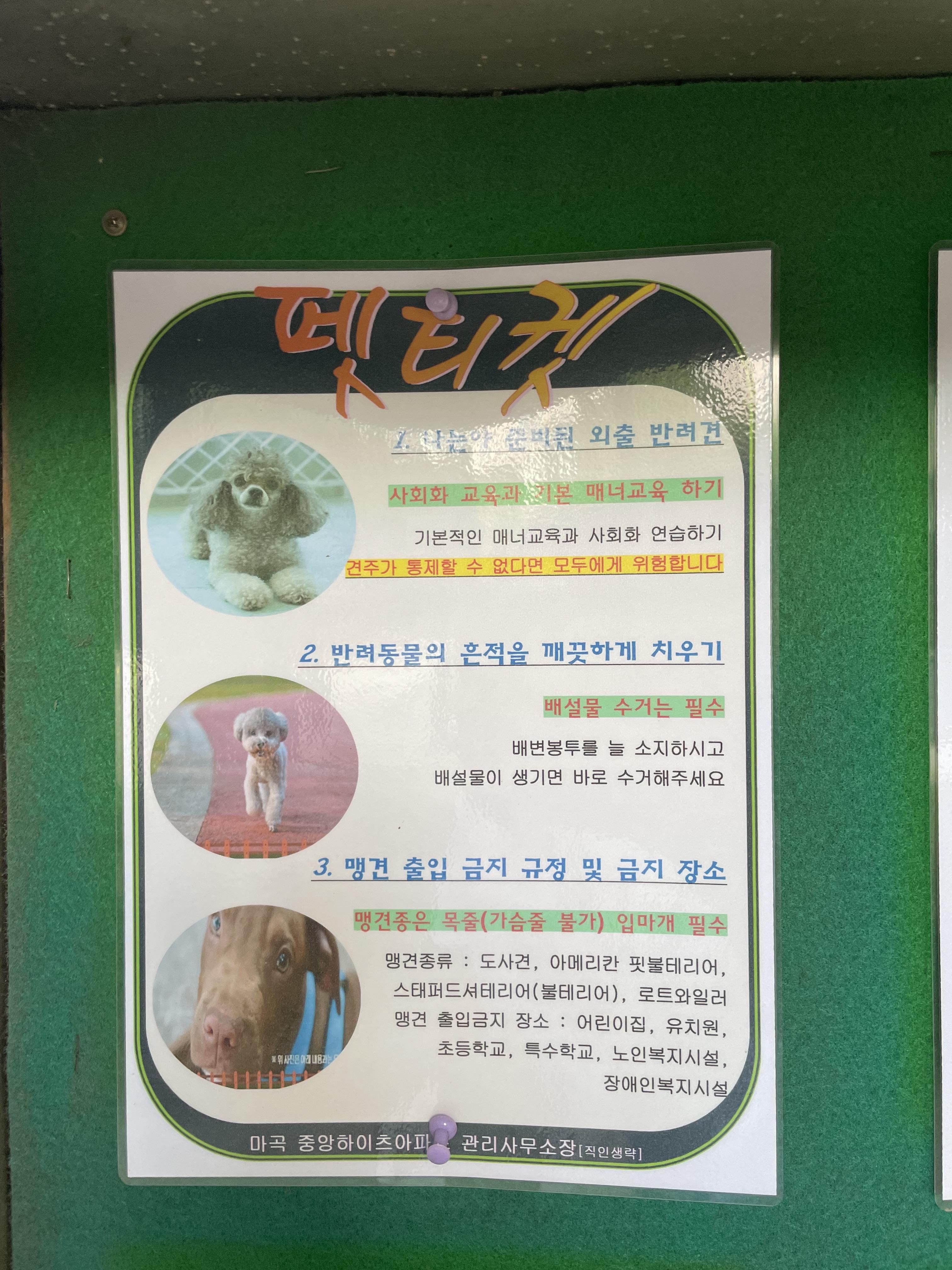 펫티켓 안내문을 보니 마곡중앙하이츠아파트 관리사무소 소장님께서 살기 좋은 동네를 만들기 위해 노력하고 계심을 느낄 수 있었습니다.
