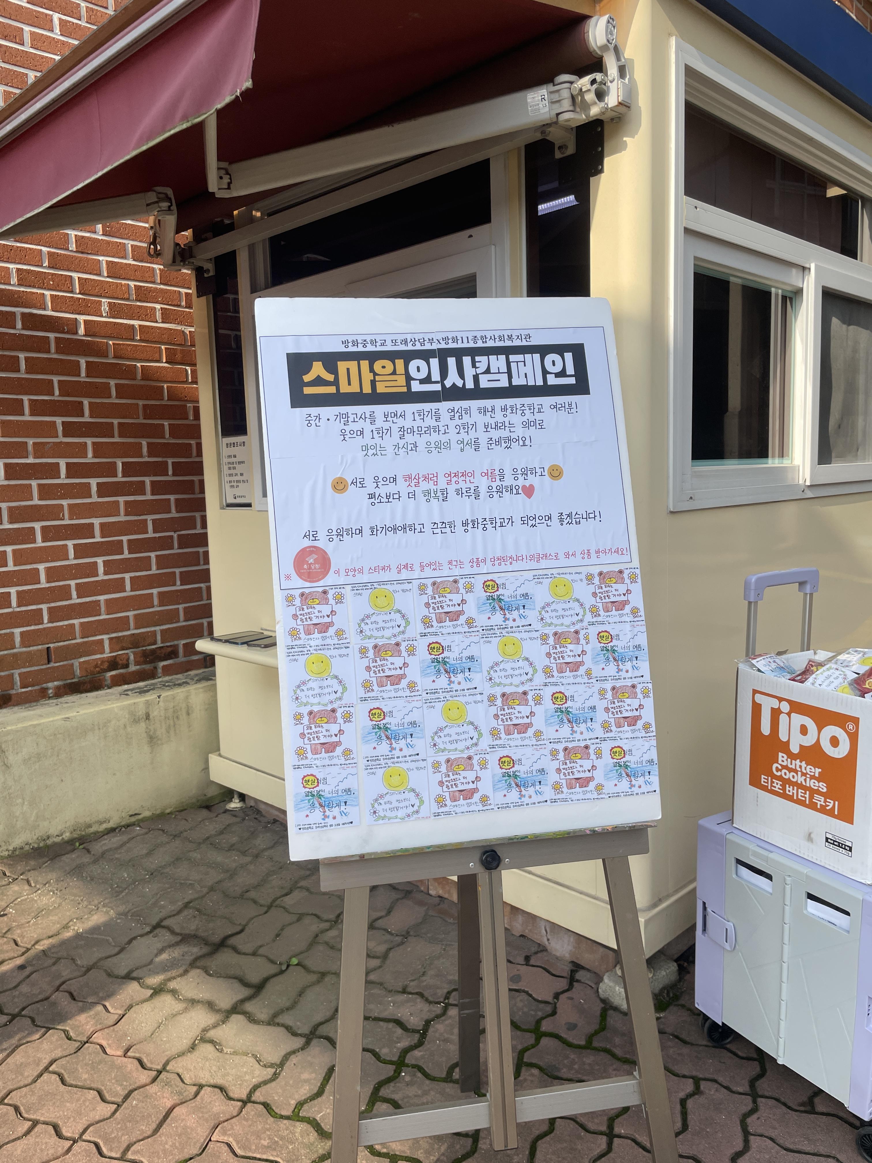 - 등교하면서 간식을 받으니 방학전 날인 오늘 학교 가기 싫었던 감정이 씻겨나가는 기분이 들었어요. 그리고 간식을 주며 좋은 하루를 보내라고 해서 더더욱 기분이 좋았어요. 앞으로도 이런 캠페인이 지속되어서 방화중 학생들을 행복하게 해줬으면 좋겠어요.