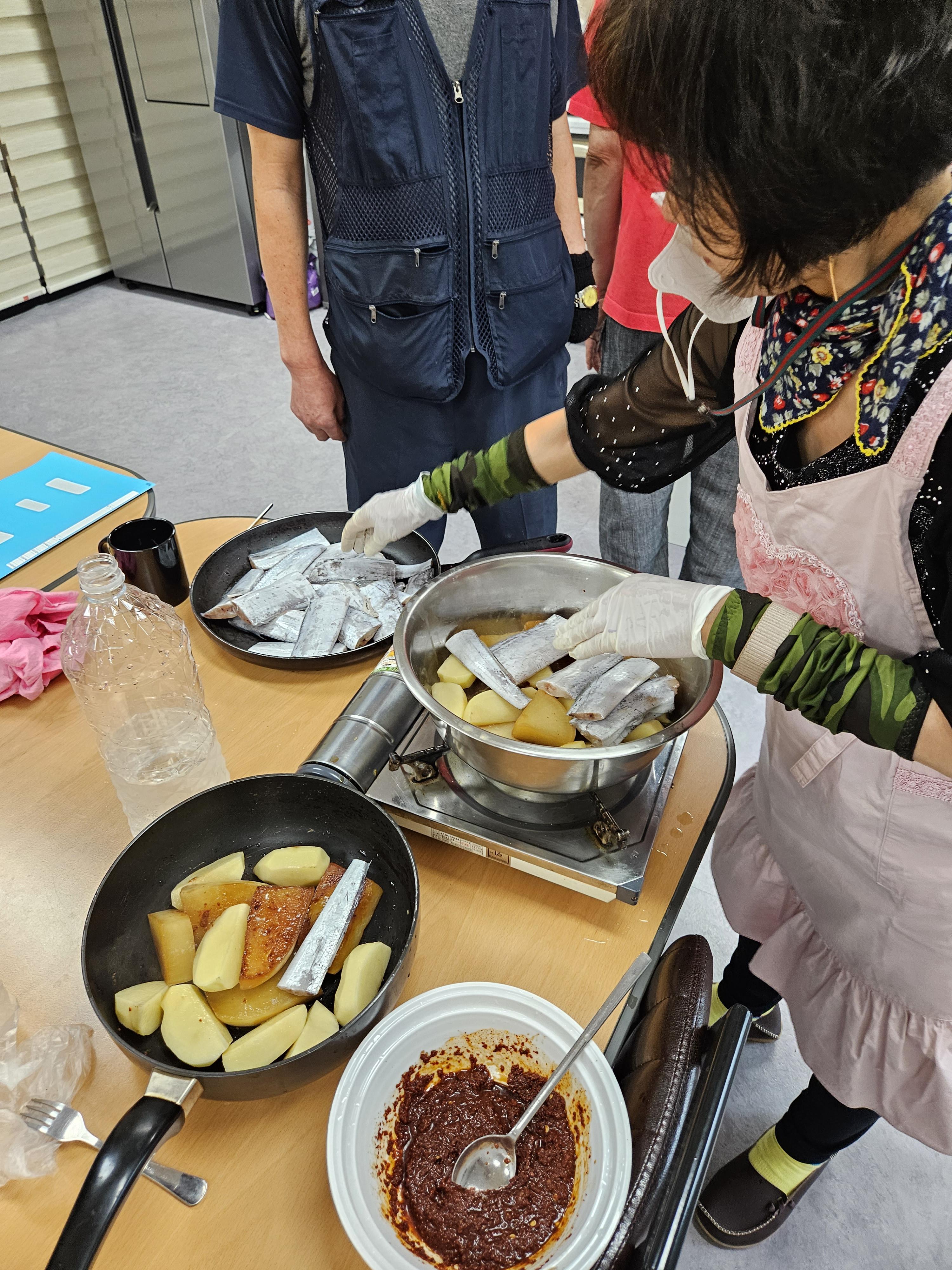 요리하는 동안 누구는 재료를 손질하고 누군가는 깨를 으깨는 등 역할을 맡아 배웠습니다.