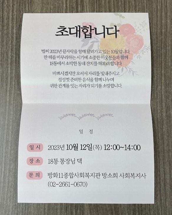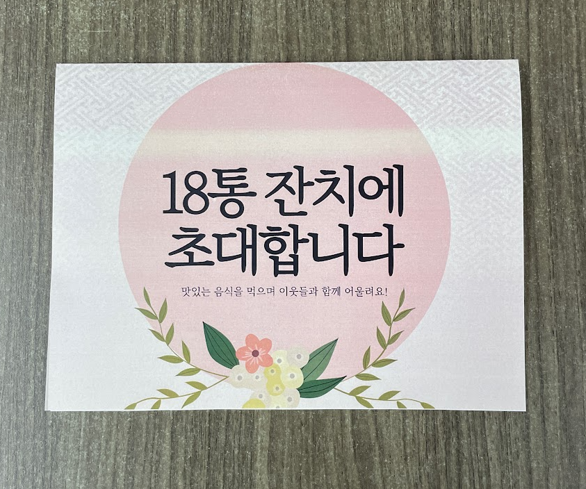 통장님과 함께 알고 있는 이웃분들을 잔치에 초대하고, 잔치에 필요한 물품을 준비하기로 했습니다. 잔치에 초대받을 때부터 이웃분들께서 귀한 대접 받는다고 느끼시길 바라는 마음으로 정성껏 초대장을 만들고, 직접 얼굴 뵙고 전달해 드렸습니다.