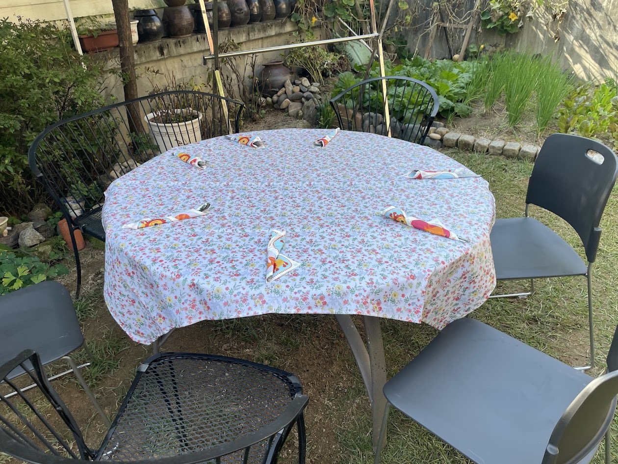 잔치 장소인 통장님 댁 앞마당에 식탁보를 깔았습니다. 통장님께서 예쁜 냅킨을 가져오시더니 수저를 하나씩 포장하셨습니다. 이웃분들을 귀하게 생각하시는 통장님의 따뜻한 마음이 느껴졌습니다.