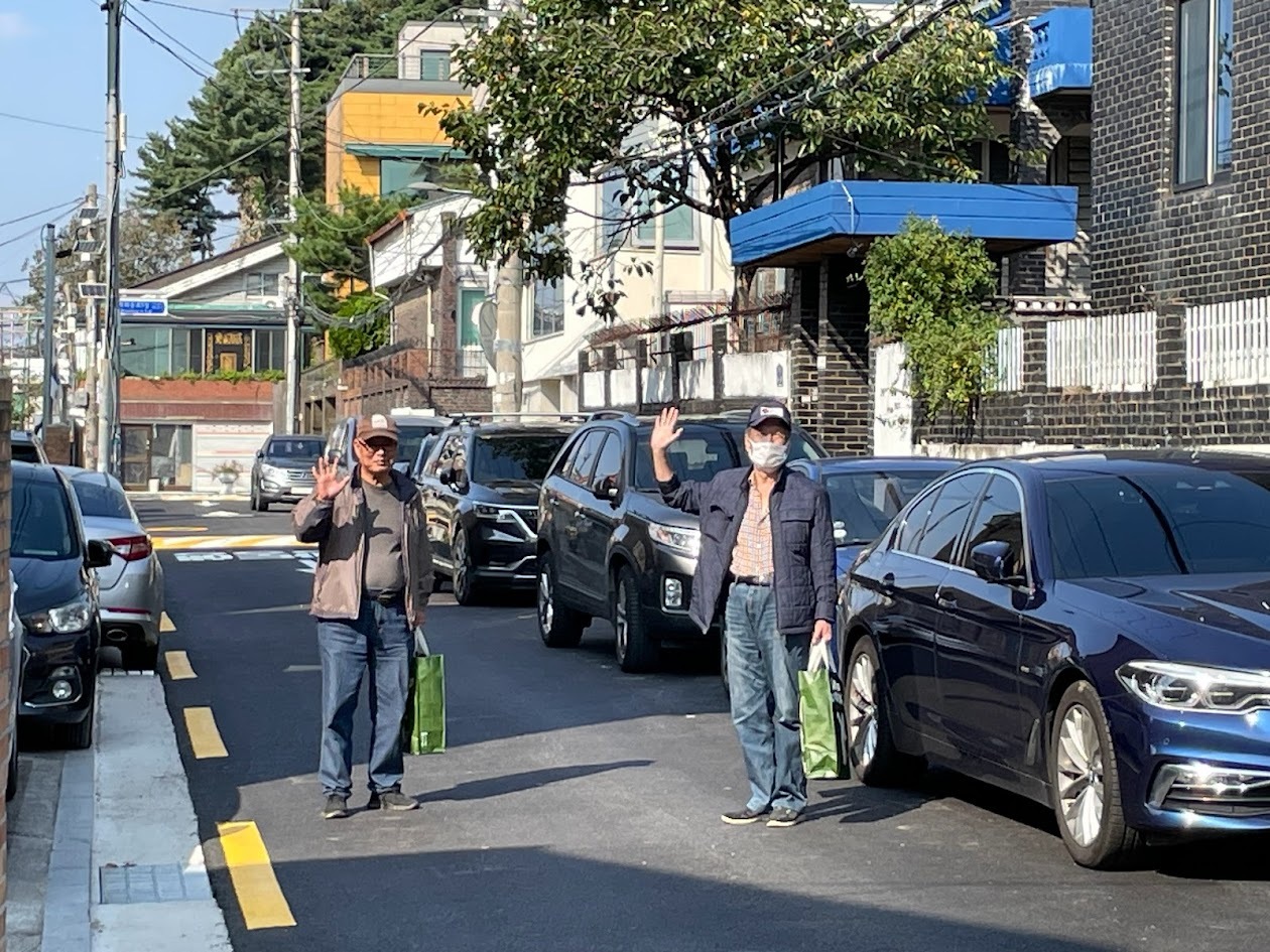 점심 잔치가 끝나고 이웃분들께서 집으로 돌아가셨습니다. 가시는 길에 감사한 마음을 더하기 위해 꾸러미와 엽서를 함께 전달해드렸습니다. 박 씨 아저씨와 최 씨 아저씨의 뒷모습을 바라보다 "박 씨 아저씨!", "최 씨 아저씨!"하고 불렀습니다. 손을 흔들며 인사해주셨습니다.
