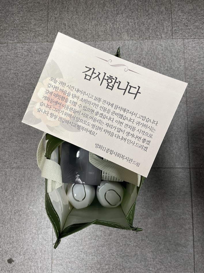 저에겐 첫 잔치였습니다. 복지관에서 하고자 하는 일의 취지를 잘 알아주시고 그런 경험이 풍부하신 박용금 통장님과 함께할 수 있어 영광이었습니다. 이웃 관계를 잇는 첫 단추를 잘 끼우고 나니 남은 단추도 술술 잘 끼울 수 있을 것 같습니다. 다음 단추는 식사 모임으로 찾아옵니다! 많이 기대해주세요😍