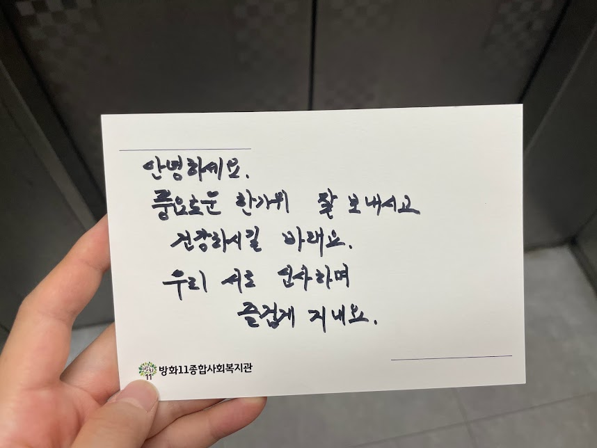 - 너무 좋았죠. 내가 뭐 별 것도 안 했는데 이렇게 편지까지 받으니까 기분이 참 좋네요. 우리 층 이웃들 다 같이 모인 거 처음이었어요. 좋았지요.