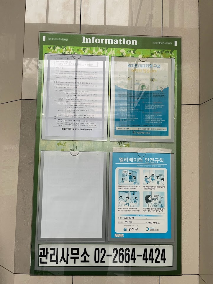 게시판을 살펴보니 공용공간에 적치된 쓰레기 및 개인 화물에 대한 안내문이 부착되어 있습니다.