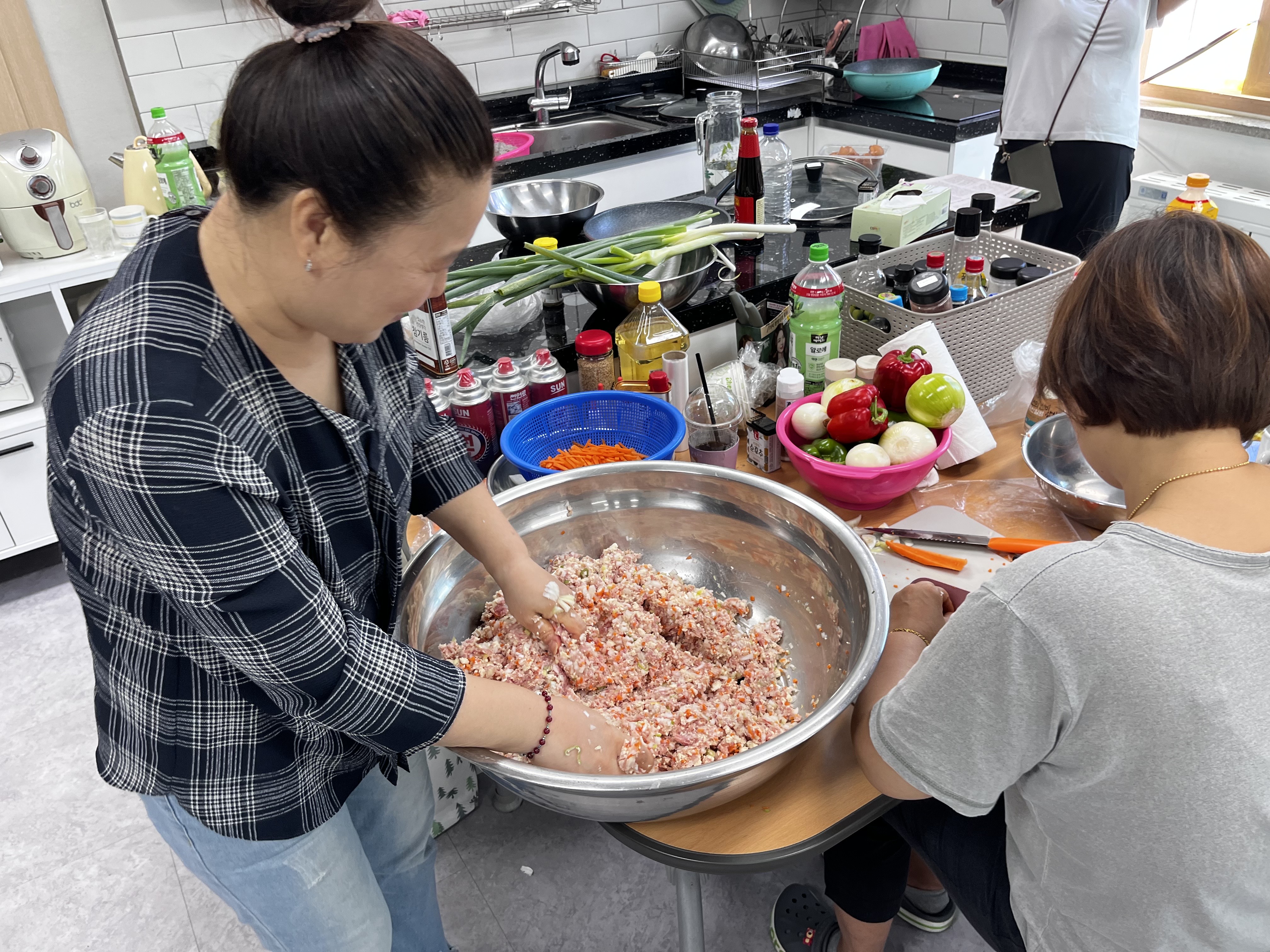 재료가 완성되고 회원님들이 모여 한쪽에서는 동그랑땡 모양을 만들고