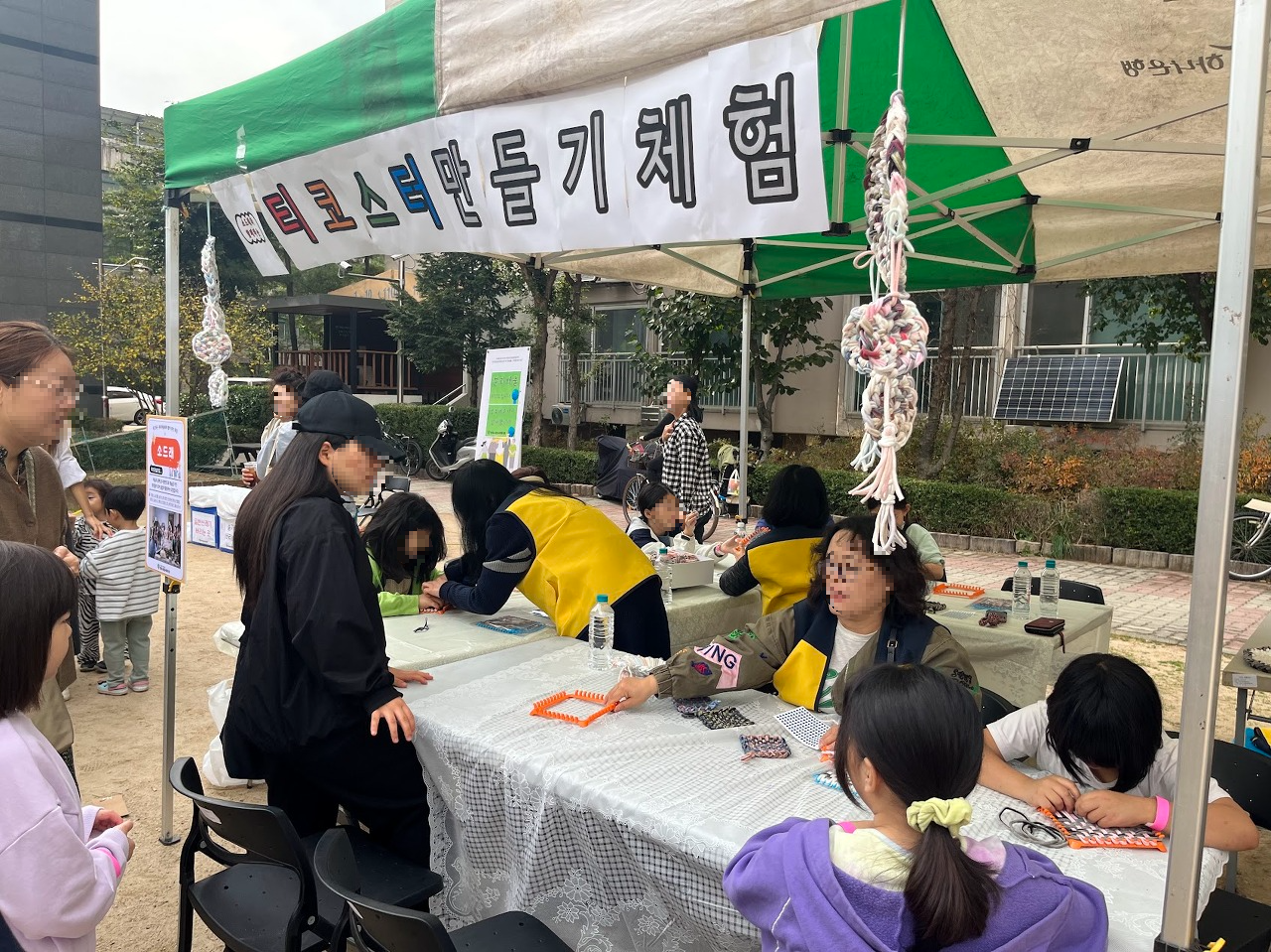소드래 모임은 양말목과 직조틀을 활용해 티코스터(컵받침) 만들기 체험부스를 운영했습니다. 집에서 사용할 수 있는 실용적인 물건을 만들어 더 즐겁게 활동하셨을 것 같습니다.