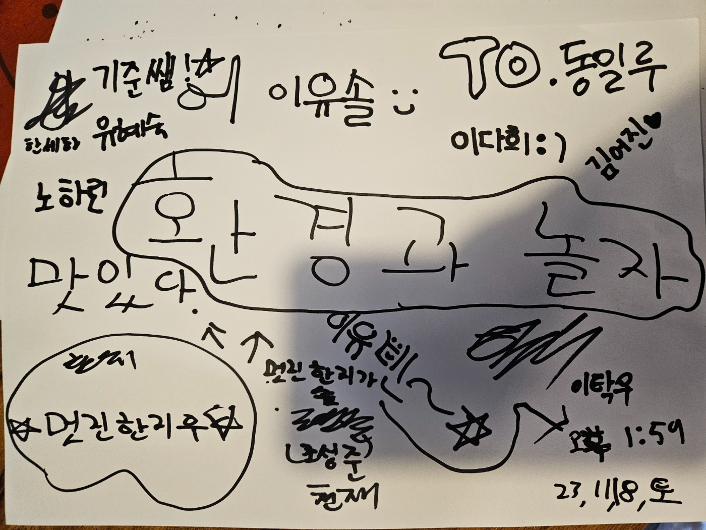 “식당 사장님께서 우리를 위해 맛있는 자장면과 밥을 더 챙겨주셔서 감사했어요. 연예인처럼 싸인을 요청해주셔서 모두 함께 종이에 싸인한 것도 재밌었어요.”