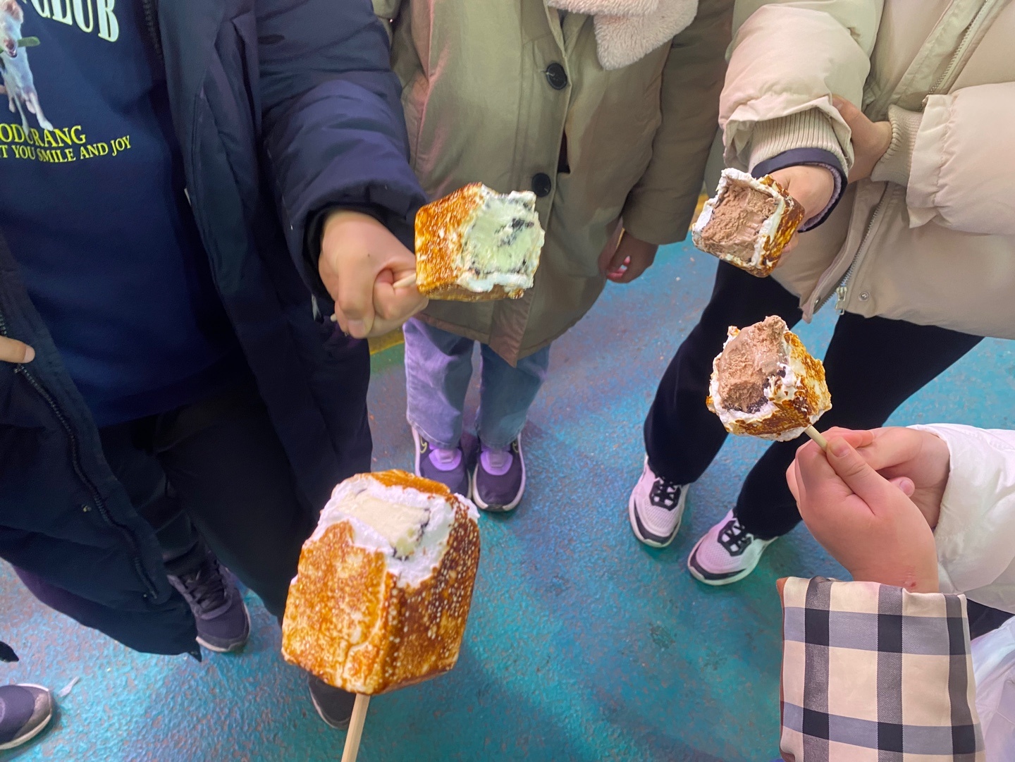 마시멜로아이스크림, 닭강정 두 가지 음식을 사먹었습니다.