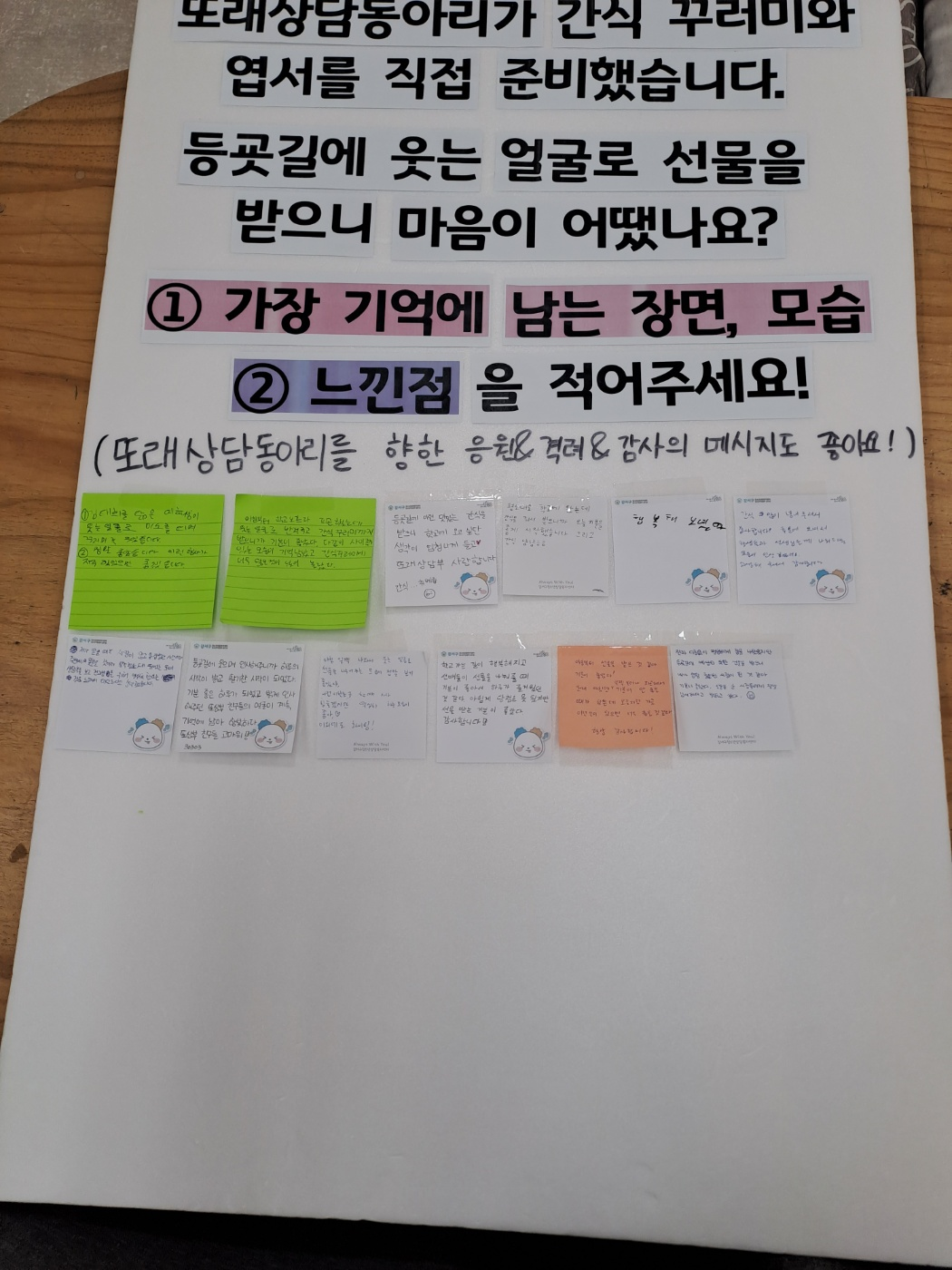 | - 아침부터 학교오느라 피곤했는데 웃는 얼굴로 반겨주고 간식꾸러미까지 받으니까 기분이 좋았어요. 다같이 사이좋게 있는 또래상담부 모습이 기억에 남았고, 간식꾸러미에 너무 맛있는 간식이 많이 들어서 놀랐어요. - 등굣길에 이런 맛있는 간식을 받으니 학교가 오고 싶단 생각이 엄청나게 들었습니다. 또래상담부 사랑합니다♡ - 평소대로 학교에 왔는데 간식을 받으니까 오늘 하루를 기분 좋게 시작했습니다. - 또래상담부가 행복해보였습니다. - 간식을 많이 주셔서 감사합니다! 학교 후문에 모여서 학생들과 선생님들께 간식꾸러미를 나눠드리는 모습이 인상 깊었어요. 고생해주셔서 감사합니다. - 김태희 닮은 여학생들이 웃는 얼굴로 미소를 띄며 꾸러미를 줬습니다. 정말 좋았습니다. 이런 캠페인이 자주 있었으면 좋겠습니다. - 사람이 많은 등굣길이었는데 또래상담부가 전교생을 위해 열심히 한다는 것을 느껴서 대단하다고 생각했습니다. - 등굣길에 웃으며 인사해주니까 하루의 시작이 밝고 활기찬 시작이 되었습니다. 기분 좋은 하루가 되었고 밝게 인사해주던 또래상담부 친구들의 얼굴이 계속 기억에 남아서 행복했어요. 또래상담부 친구들아 고마워~! -아침 일찍 나와서 웃는 얼굴로 선물을 나눠주는 모습이 정말 보기 좋았어요. 이런 캠페인을 할 때는 힘들겠지만 열심히 하는 모습이 참 보기 좋았어요. 또래상담동아리 화이팅! - 학교 가는 길이 행복해지고 선배들이 선물을 나눠줄 때 기분이 좋아서 하루가 즐거웠던 것 같아요. 감사합니다! - 아침부터 선물을 받는 것 같아 기분이 좋았어요. 원래 아침엔 일찍 일어나 피곤해서 기분이 안좋은 때가 있는데 오늘처럼 가끔 이런 캠페인이 있으며 너무 좋을 것 같아요. 항상 감사합니다! - 전과 다름없이 평범하게 집을 나왔지만 등굣길에 예상치 못한 선물을 받으니 내가 엄청 중요한 사람이 된 것 같아서 기분이 좋았다. 선물을 준 또래상담동아리에게 정말 감사하다고 말하고 싶다. |