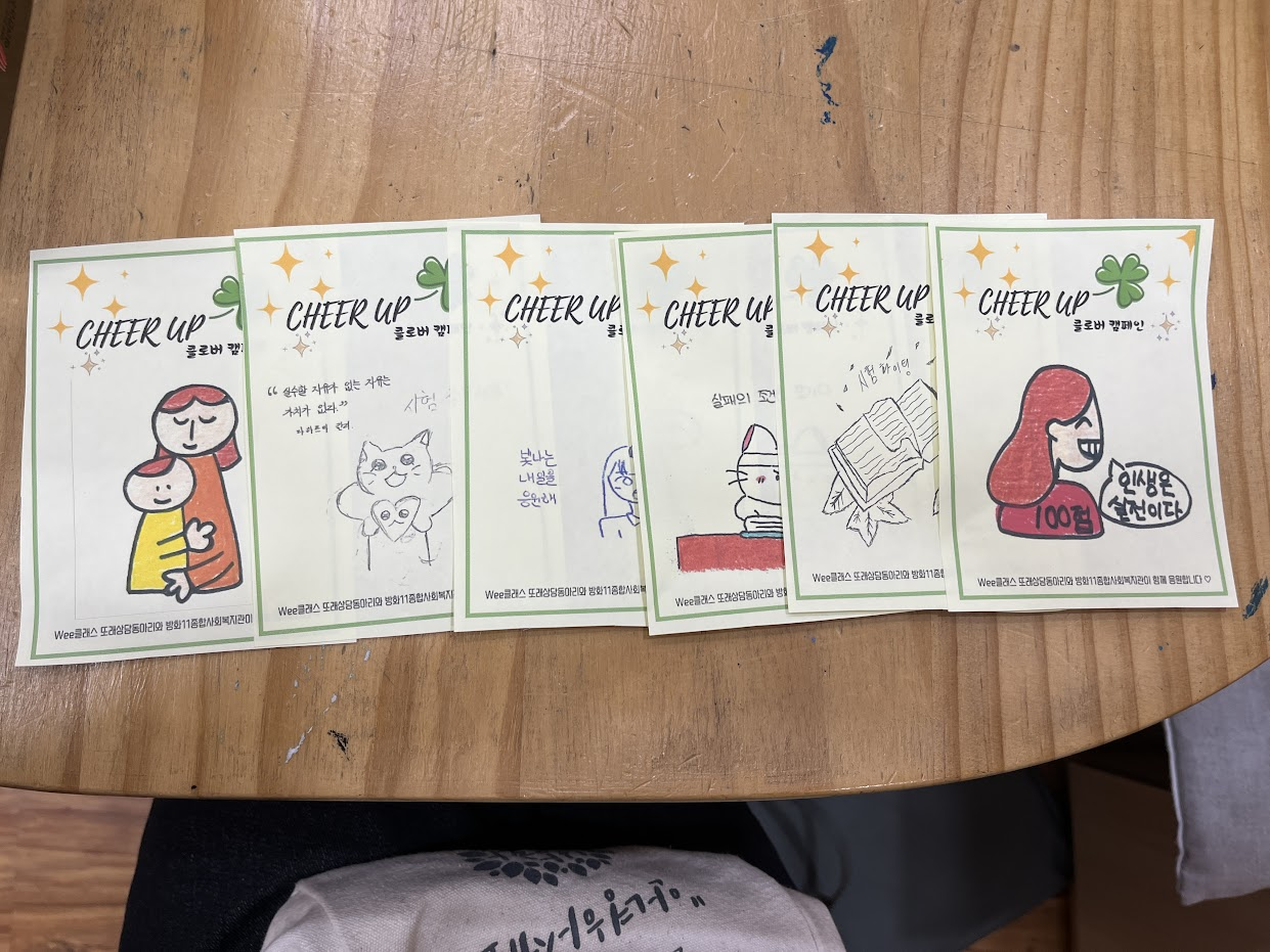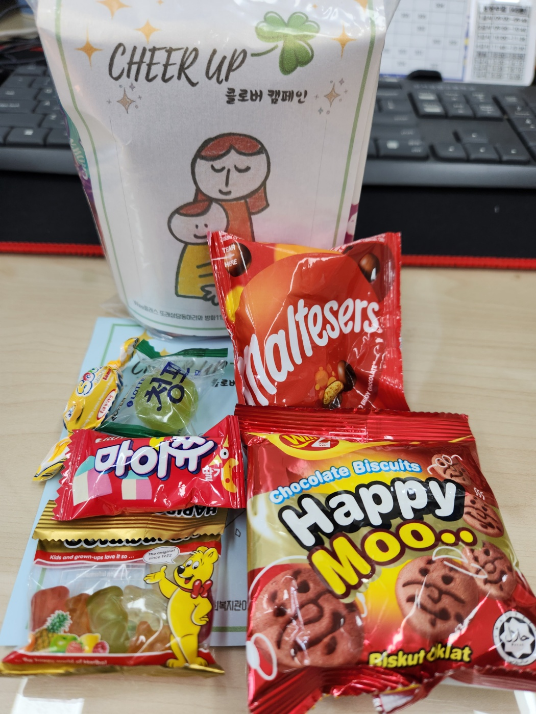 cheer up 인사캠페인 답게 응원하는 말과 함께 간식 꾸러미를 건넸습니다.