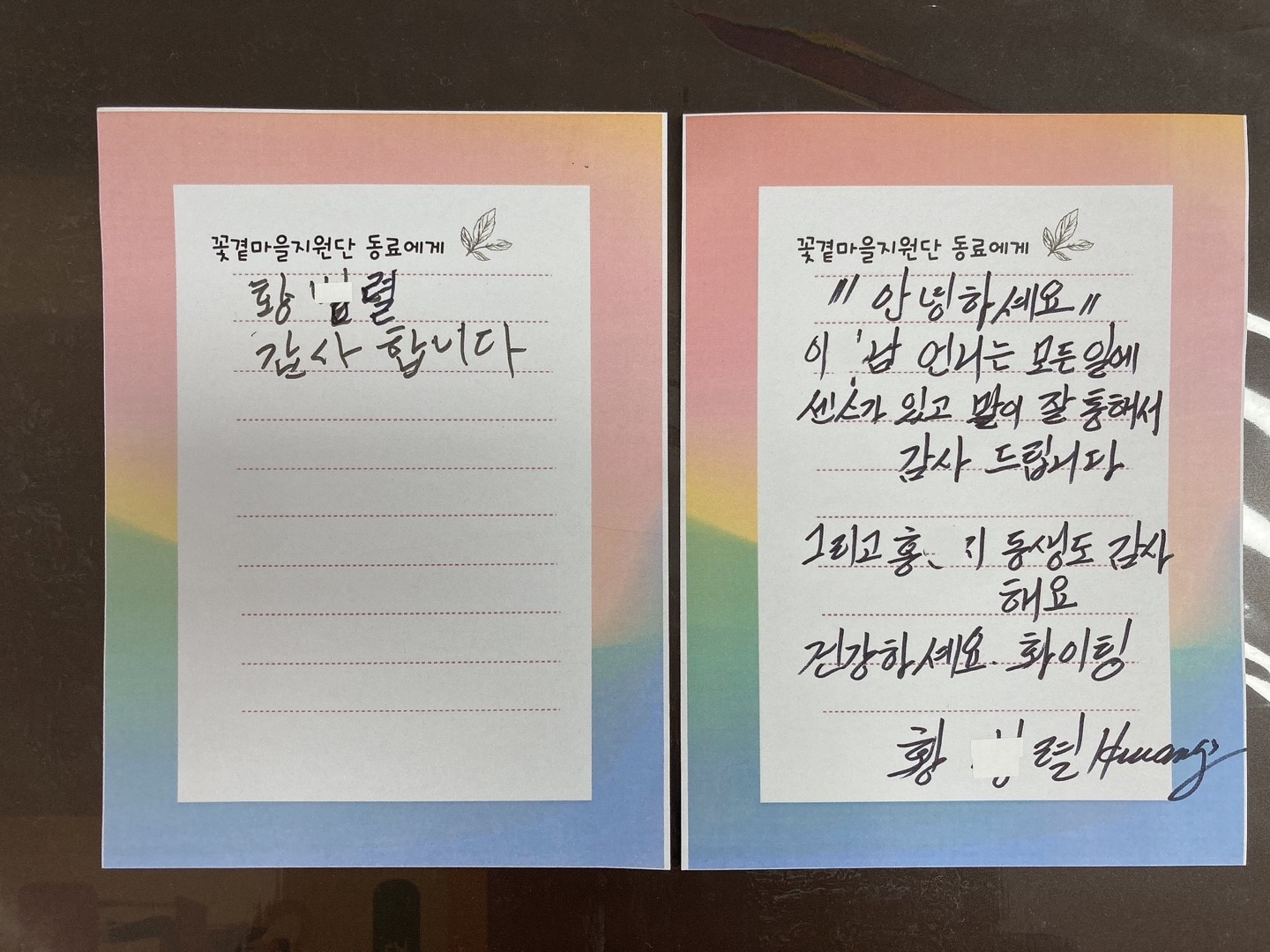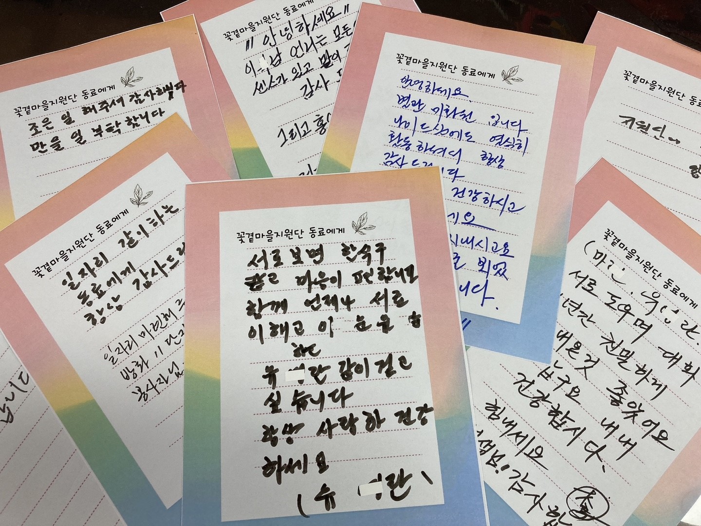 "오래토록 얼굴 뵈었으면 좋겠습니다. 앞으로도 건강하시고 행복하세요." "좋은 일자리 마련해 주어서 고맙습니다." "서로 도우며 대화하며 1년 동안 친밀하게 지내온 것 좋았어요." "인권이란 것을 생각해 볼 수 있어서 좋은 시간이 되었어요." |