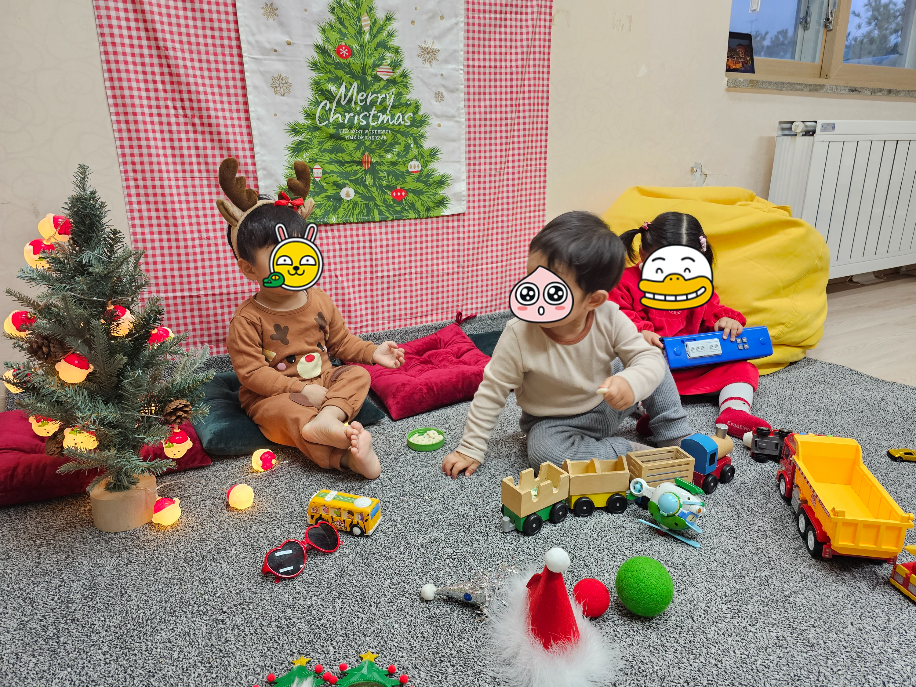 어머님들께 육아모임 평가회 날짜를 언제로 하면 좋을지 여쭤봤습니다. 어머님들께서 먼저 지난 번처럼 아이들이랑 같이 사진찍으면 어떠냐고 제안해주셨습니다. 어머님들께서 직접 트리, 장난감 등 연말 느낌이 나는 소품을 준비해주셨습니다. 복지관에서는 평가회 때 함께 먹을 음식을 준비했습니다.