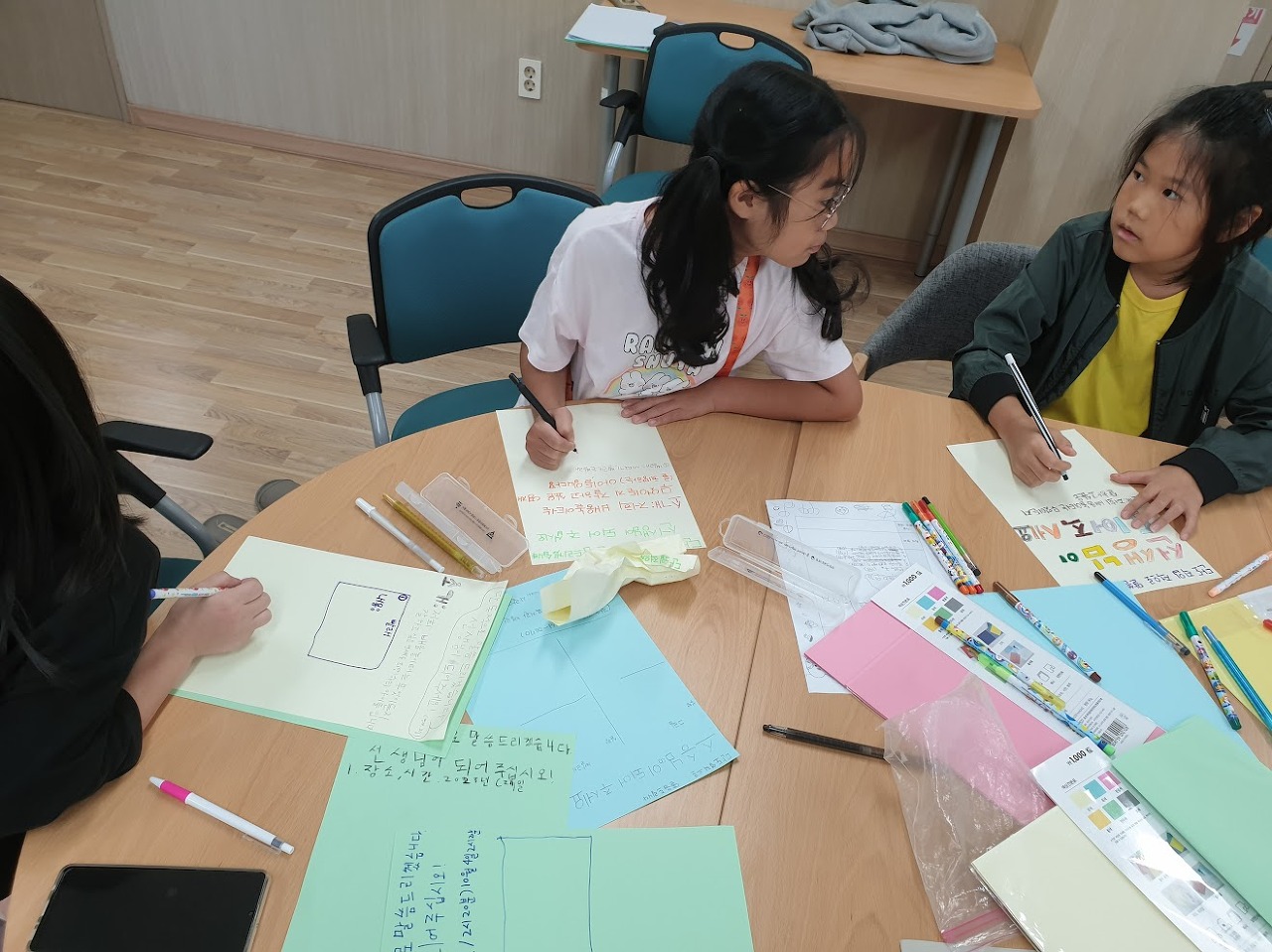 회의가 끝나고 아이들이 자리를 잡고 각자 홍보지 한 장씩을 만듭니다.