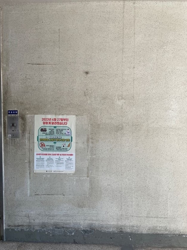 동에 들어가면 각 동 초소가 있습니다. 지금은 초소로 이용하지는 않고, 청소도구 등 아파트에 필요한 여러 물품을 보관하는 창고로 이용하고 있습니다. 관리원분들께서 정문 큰 초소에서 전체 동을 살펴봐주고 계십니다. 입구에는 엘레베이터가 있고, 그 사이에 아파트 단지에서 안내해야하는 여러 안내판, 홍보지 등이 붙어있습니다.