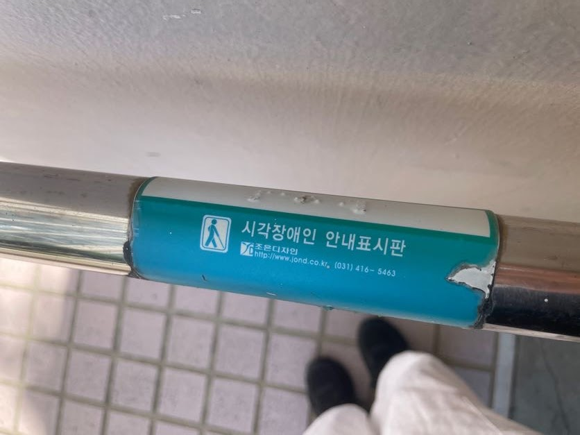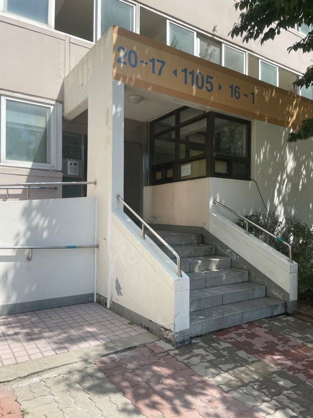 각 동 입구에는 계단과 경사길이 있습니다. 방화11단지아파트에는 거동이 불편하여 휠체어를 타는 입주민들이 많이 계십니다. 지역을 다니다 보면 전동 휠체어를 타고 오가는 주민분들을 많이 뵐 수 있습니다. 경사길에 시각장애인 안내표시판도 설치되어 있었습니다.