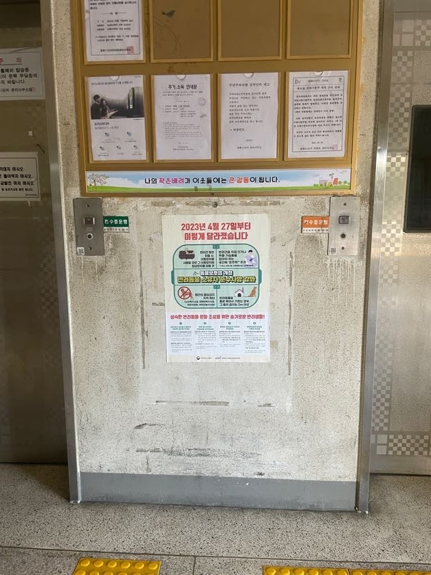 동에 들어가면 각 동 초소가 있습니다. 지금은 초소로 이용하지는 않고, 청소도구 등 아파트에 필요한 여러 물품을 보관하는 창고로 이용하고 있습니다. 관리원분들께서 정문 큰 초소에서 전체 동을 살펴봐주고 계십니다. 입구에는 엘레베이터가 있고, 그 사이에 아파트 단지에서 안내해야하는 여러 안내판, 홍보지 등이 붙어있습니다.