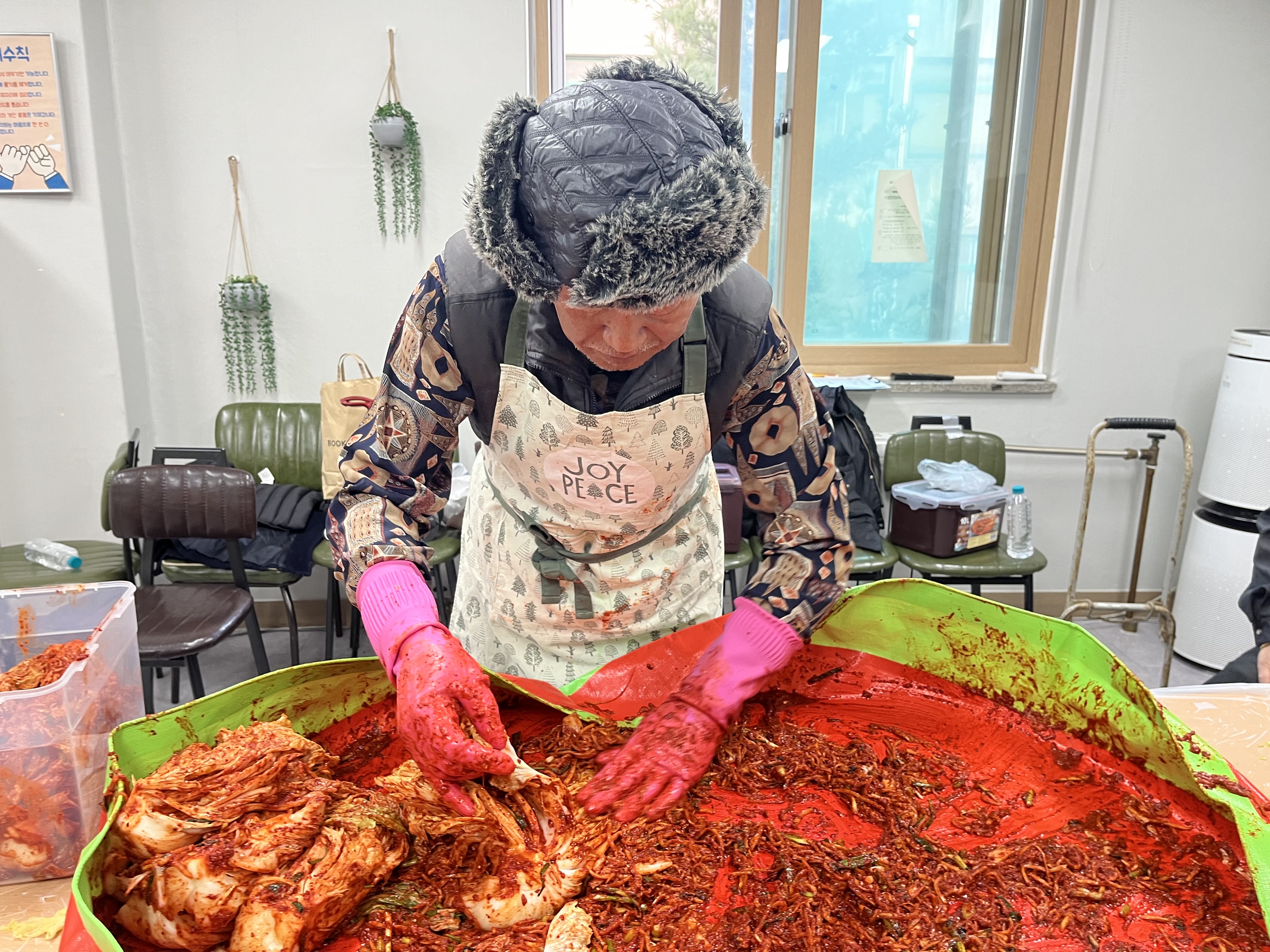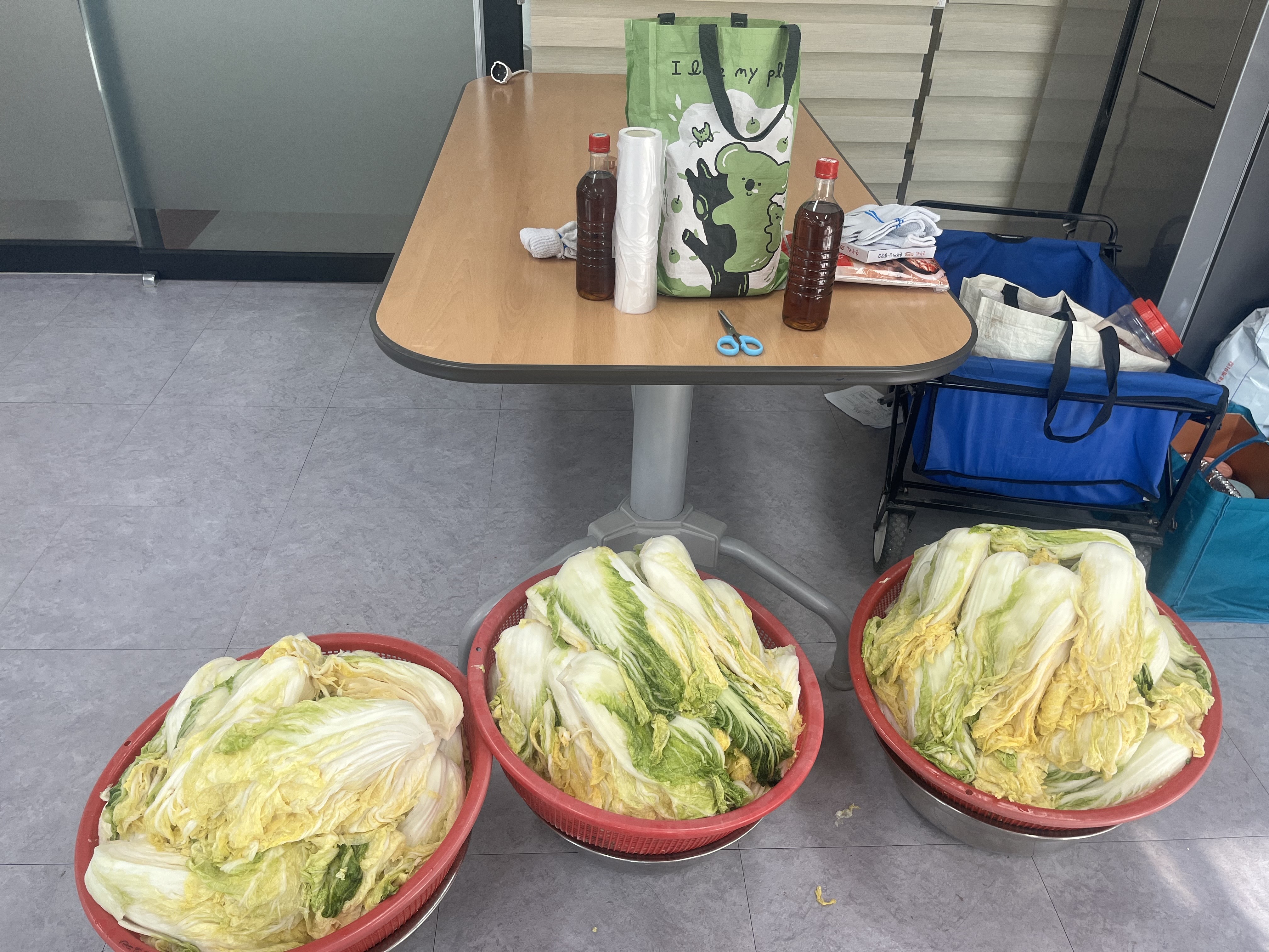 절인배추의 물을 빼기 위해 3시간 일찍 오셔서 김장김치 준비를 해주셨습니다.