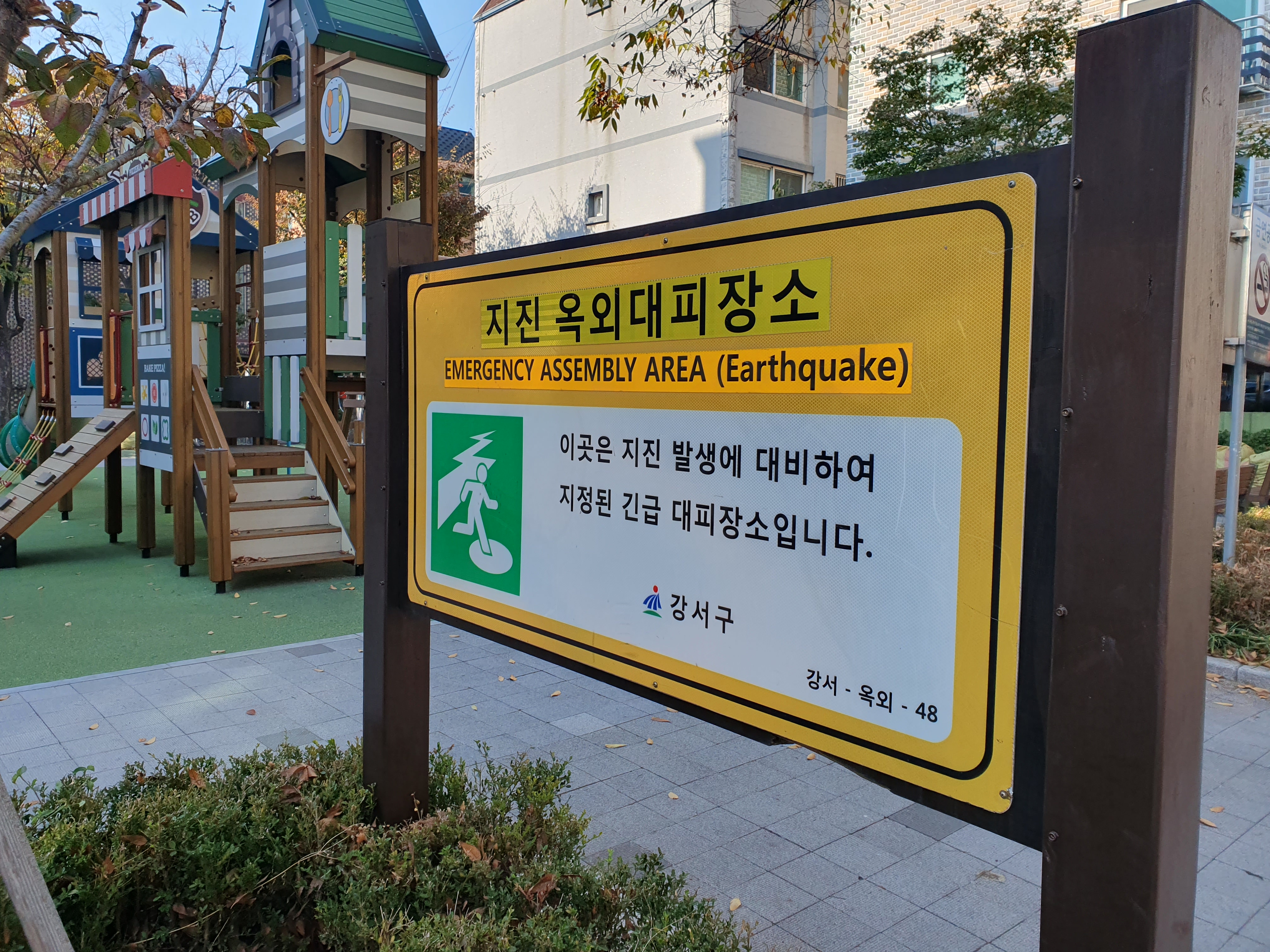 안내판에 지진 옥외대피 장소라고 쓰여있는 것을 보게 되었습니다.