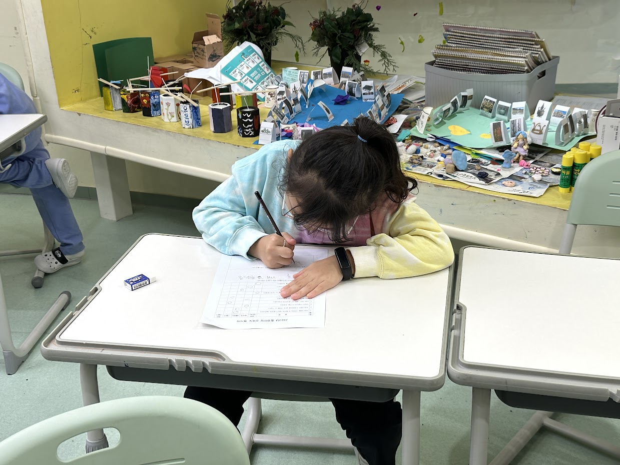 | 배움 | 가장 재밌었던 활동과 그 활동에서 배운 것? | - 쓰레기 줍기 / 지구를 도울 수 있어 뿌듯했어요. 환경을 사랑하는 마음을 갖게 되었어요. 우리가 사는 지구에 쓰레기가 많다는 것을 알게되었어요. - 비석치기(교구놀이) - 자원순환센터 |