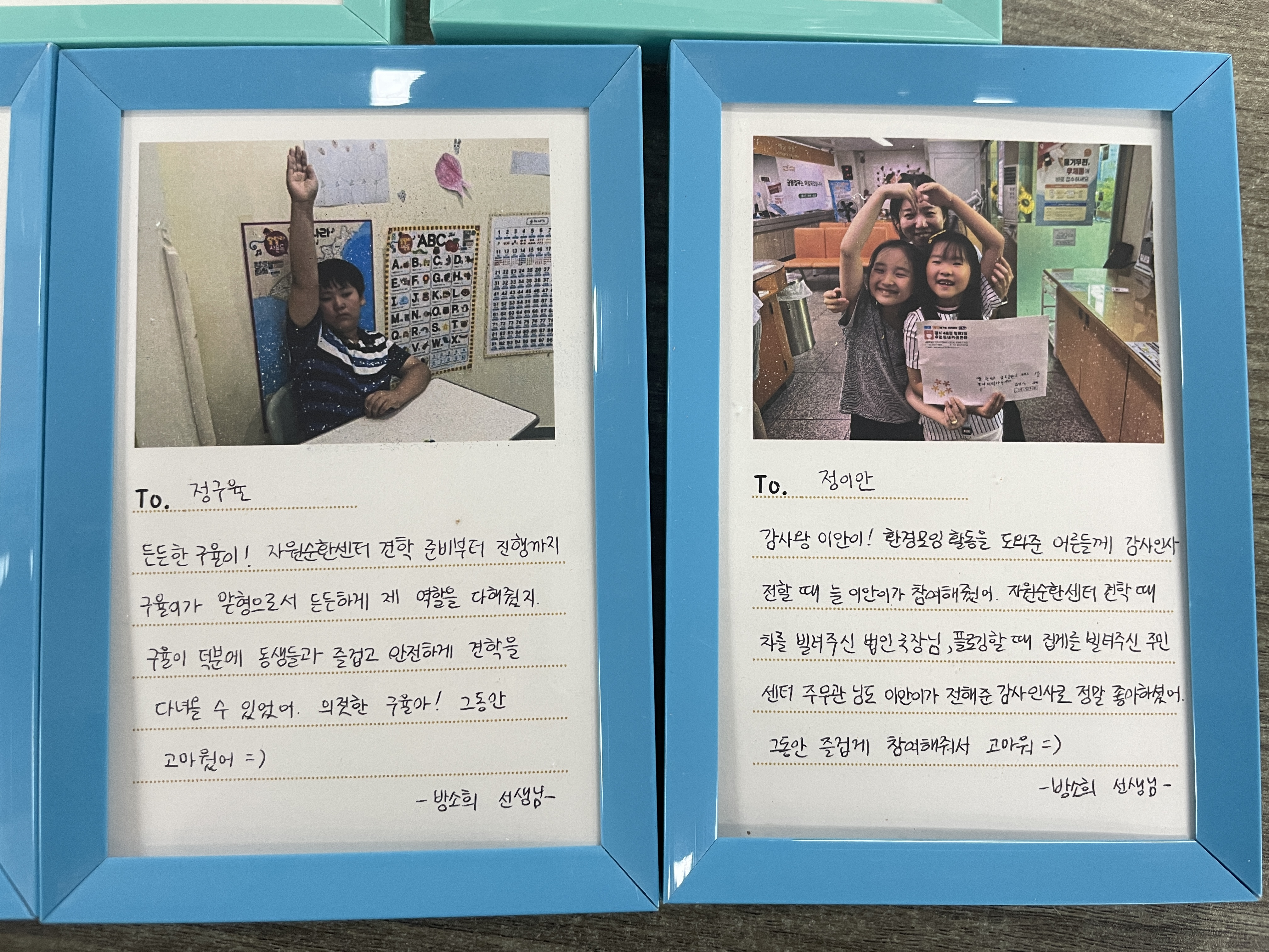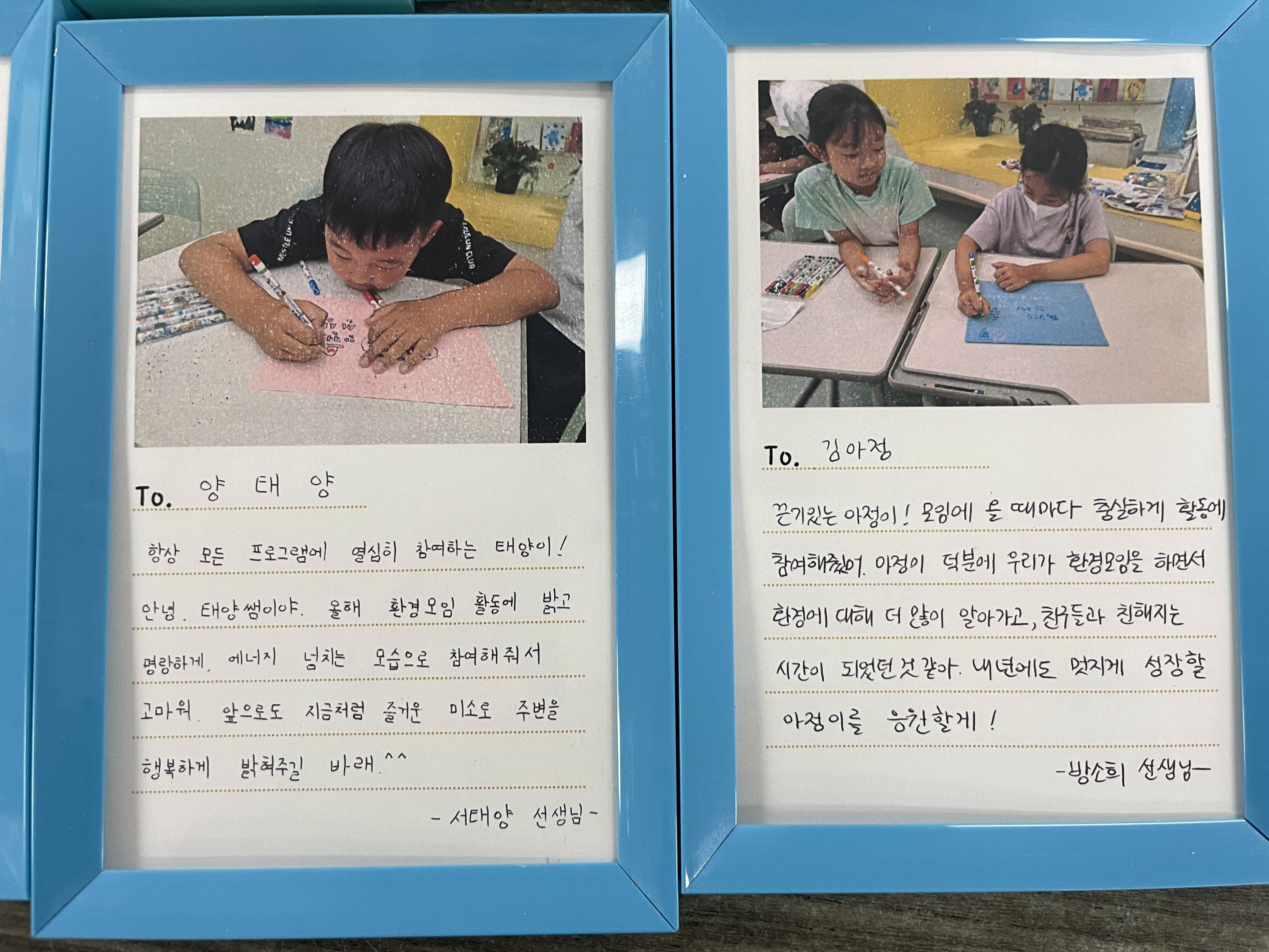 아이들이 마침식을 준비한 것처럼 저도 마침식을 준비합니다. 키움센터에서 환경모임을 담당해주시는 선생님과 함께 아이들 한 명 한 명에게 전달할 사진편지를 액자에 담아 전달하기로 했습니다.