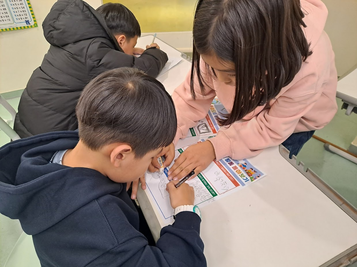 아이들과 활동 사진을 보며 환경모임을 돌아봤습니다. 사진을 모두 본 뒤 각자 배움, 소망, 감사 항목을 적어보는 시간을 가졌습니다. 혼자 작성하는 데에 어려움을 겪는 저학년 친구는 고학년 친구가 거들어주며 작성했습니다. 제가 나서지 않더라도 서로를 잘 챙기는 아이들입니다.