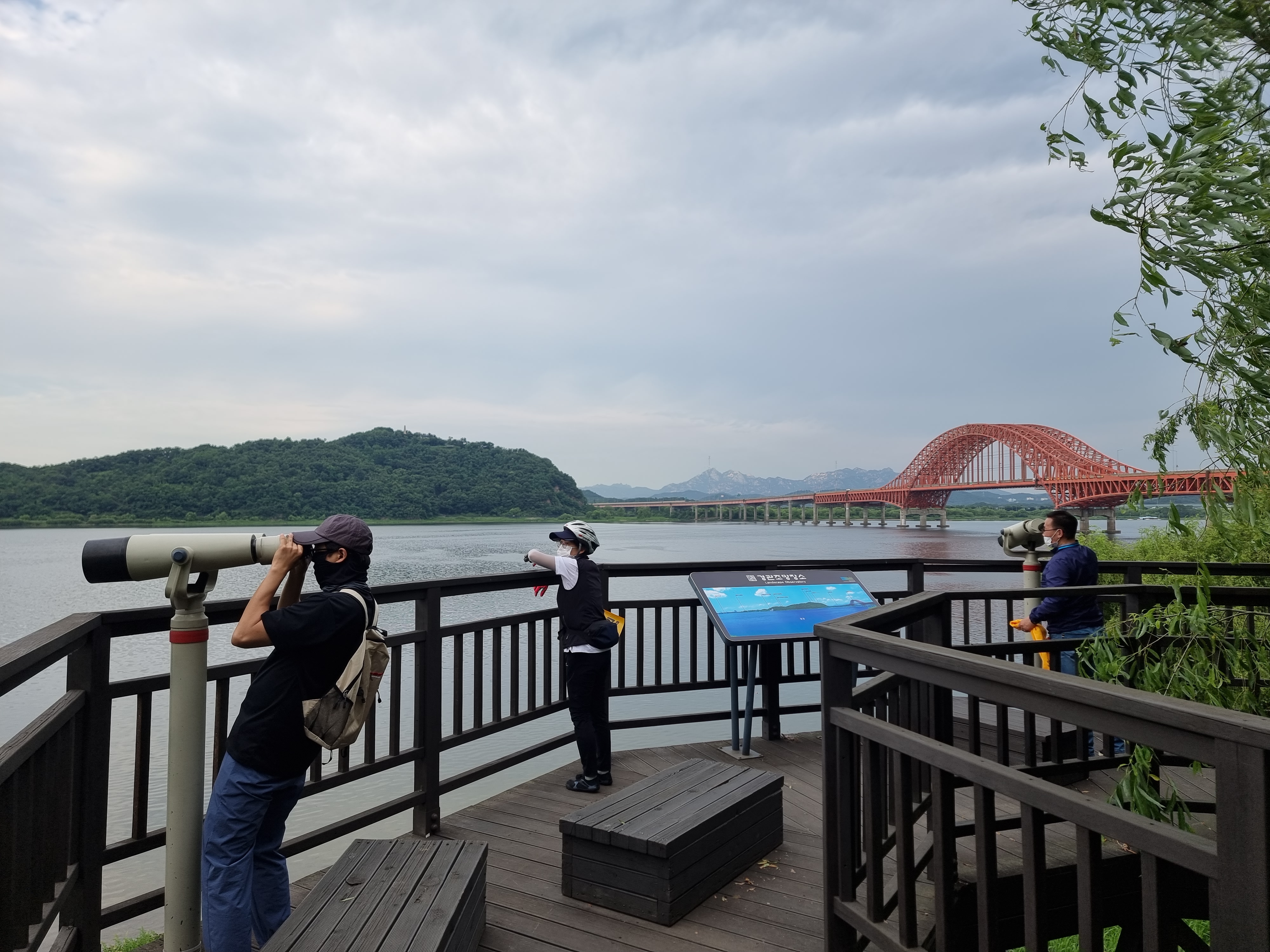 다시 방화대교 아래에 왔습니다. 강서둘레길을 걸으며 알게 된 전망대가 있어 추천했습니다. 잠시 자전거를 주차하고 전망대에 올랐습니다. 한강 전체가 한 눈에 보이고 철새들도 날아다녔습니다. 함께 사진 찍고 구경했습니다. 여기서 이진이 님은 일정이 있어 헤어졌습니다.