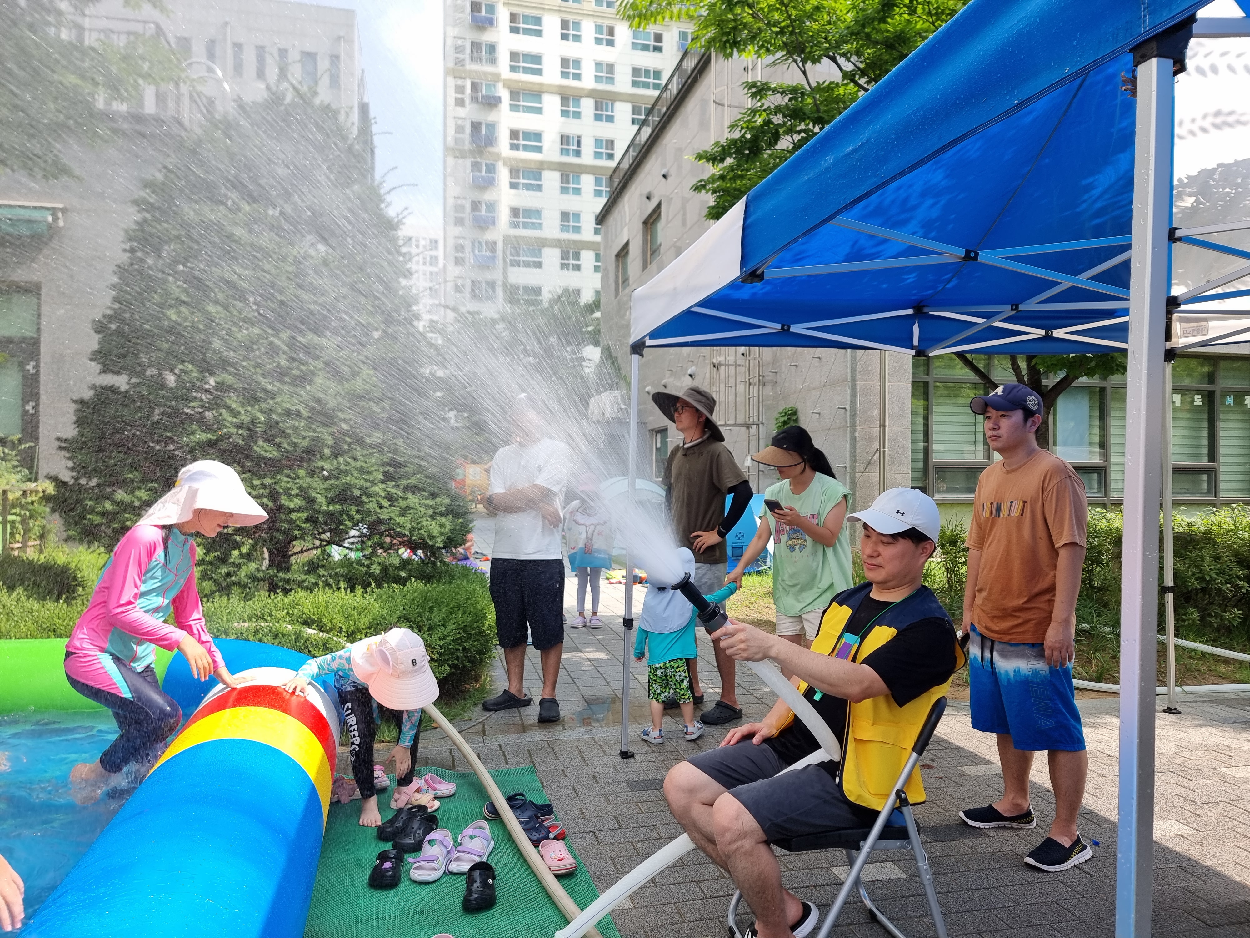 신나게 놀았습니다. 아파트 입주자 아빠들이 소방호스를 교대로 잡고 아이들 안전을 살폈습니다. 가정마다 캠핑 파라솔을 곳곳에 쳤습니다. 엄마들은 파라솔 그늘 밑에서 삼삼오오 모여 대화하며 음료를 마셨습니다. 안전을 생각해서 50분 물놀이하고 10분 쉬었습니다. 복지관에서 모집한 지역 봉사자가 곳곳에서 아이들과 함께 놀고 안전을 확인했습니다.