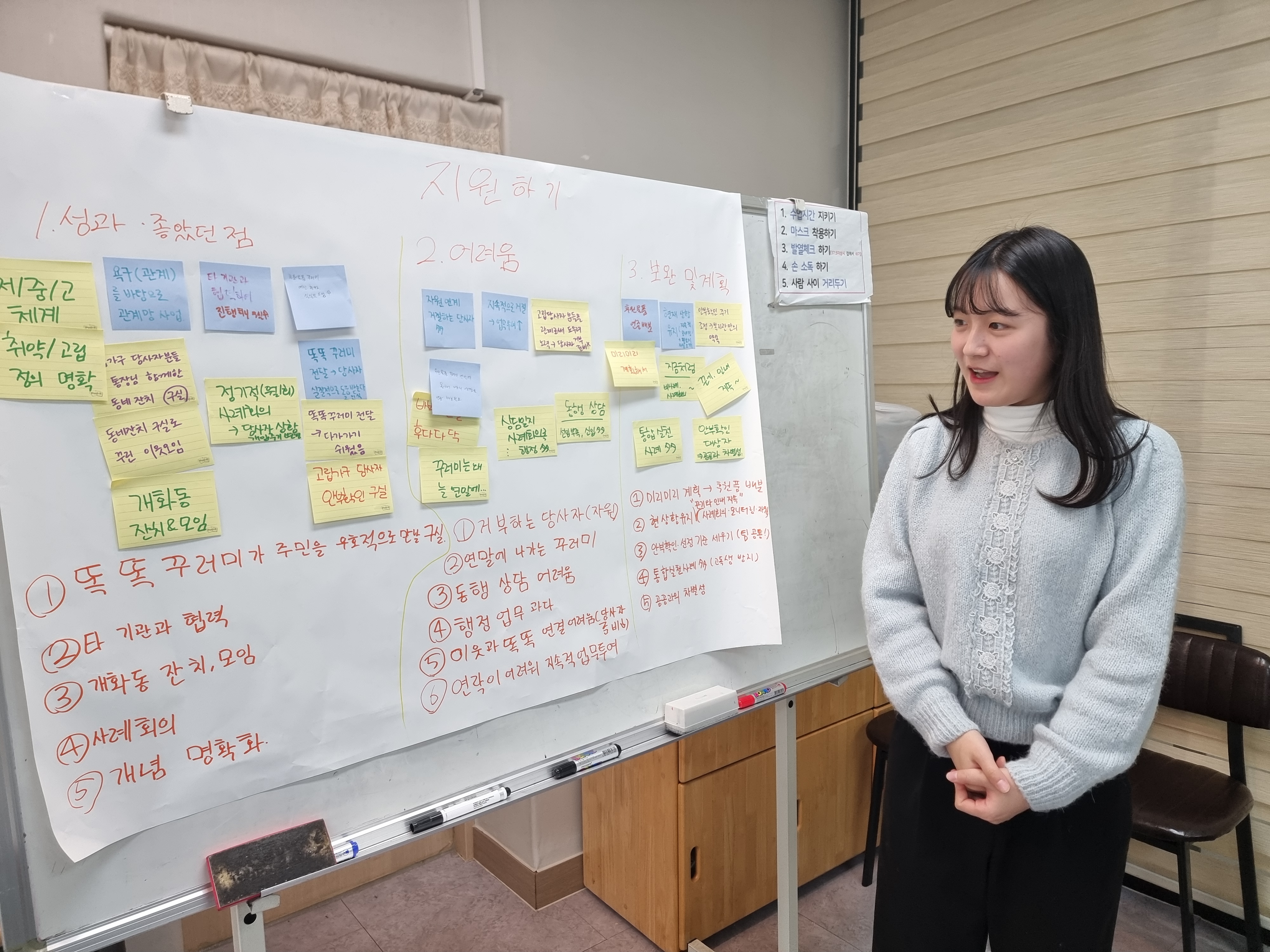 - 행정업무가 많음. 주민을 만나고 지원하는 일면 일지와 기록을 해야 하니 부담이 될 때가 있음.