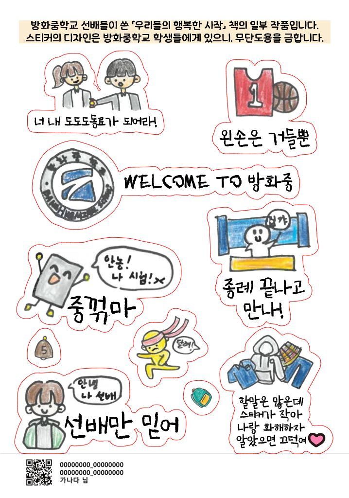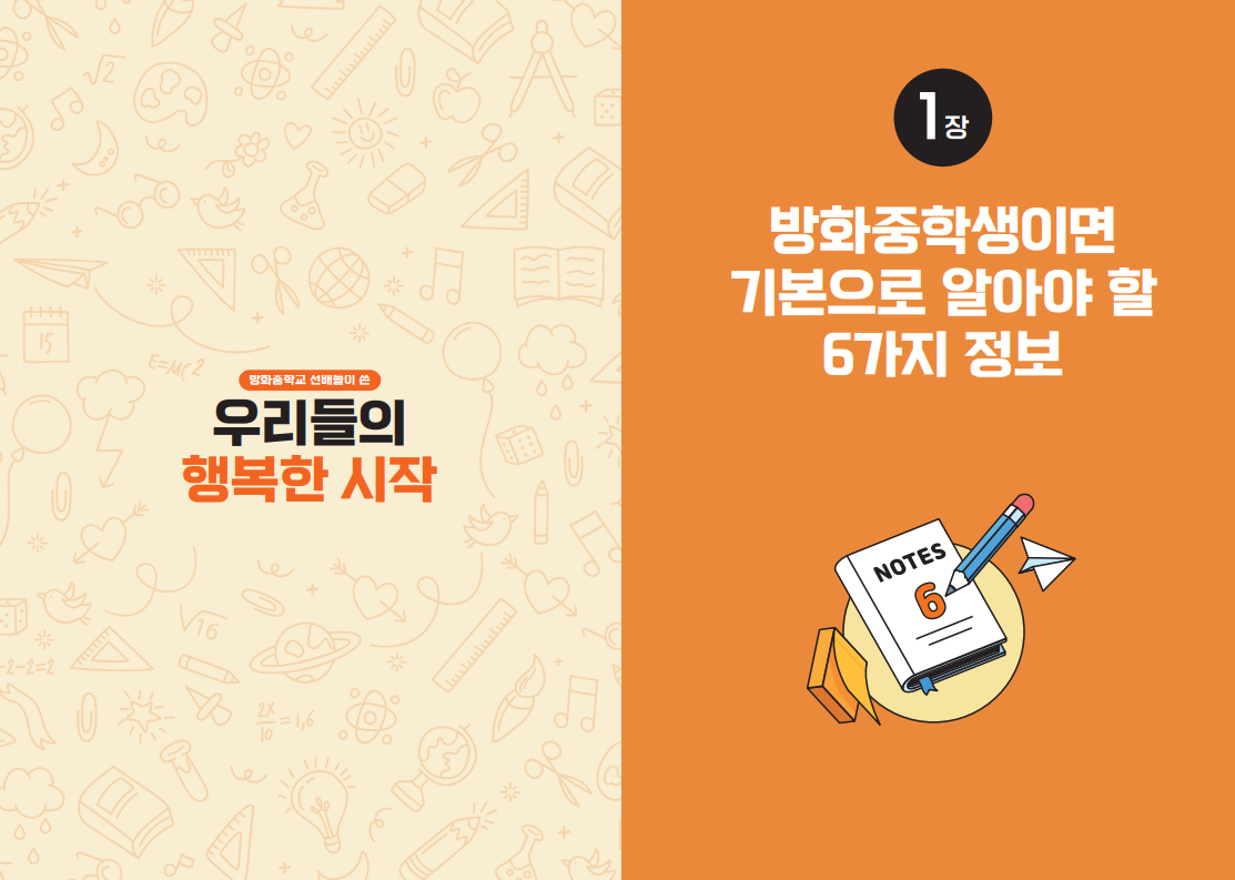 | <책 구성 내용> 1장. 방화중학생이면 기본으로 알아야 할 6가지 정보 2장. 행복한 시작을 위해서라면 필수로 알아야 할 지식 가방, 공부방법, 교과교실제, 구기대회, 급식, 급식표 보는방법, 단계별 지도, 단축수업, 등굣길, 방화예술제, 복장, 사물함, 선배, 선생님과 친해지는 방법, 성적, 수행평가, 신발장, 예비종, 잔반줄이기 행사, 종례, 중간고사와 기말고사, 창체의 날, 체육대회, 친구와 친해지는 방법, 학교 와이파이, 학생증, 학생회, 홈베이스, 휴대전화 꽂이 3장. 방화중학교 1학년의 행복을 바라며 |