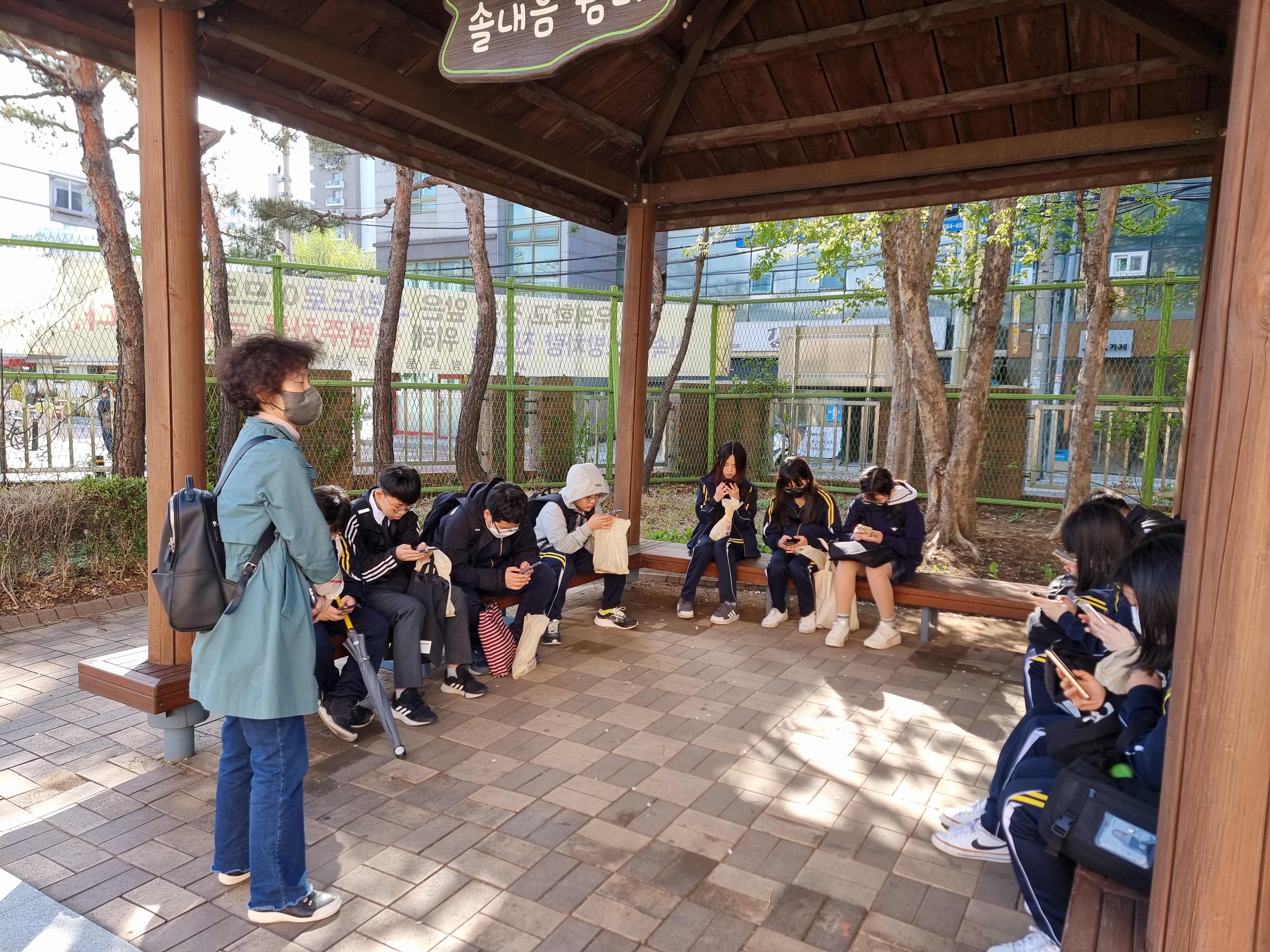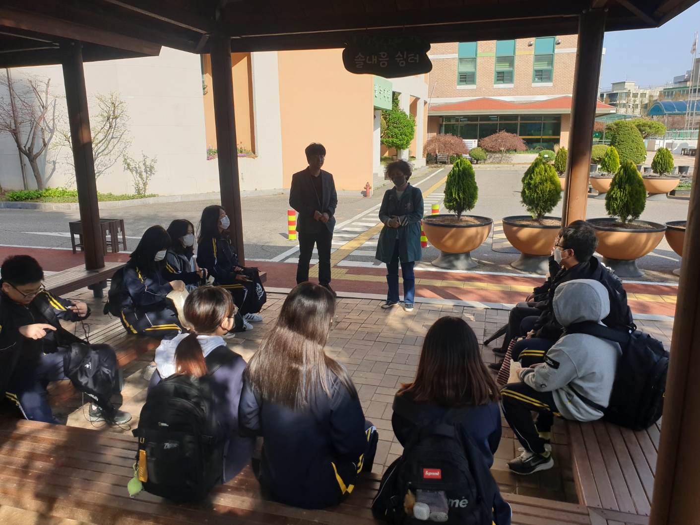 학교 등나무 밑에서 잠시 이야기 나누었습니다.