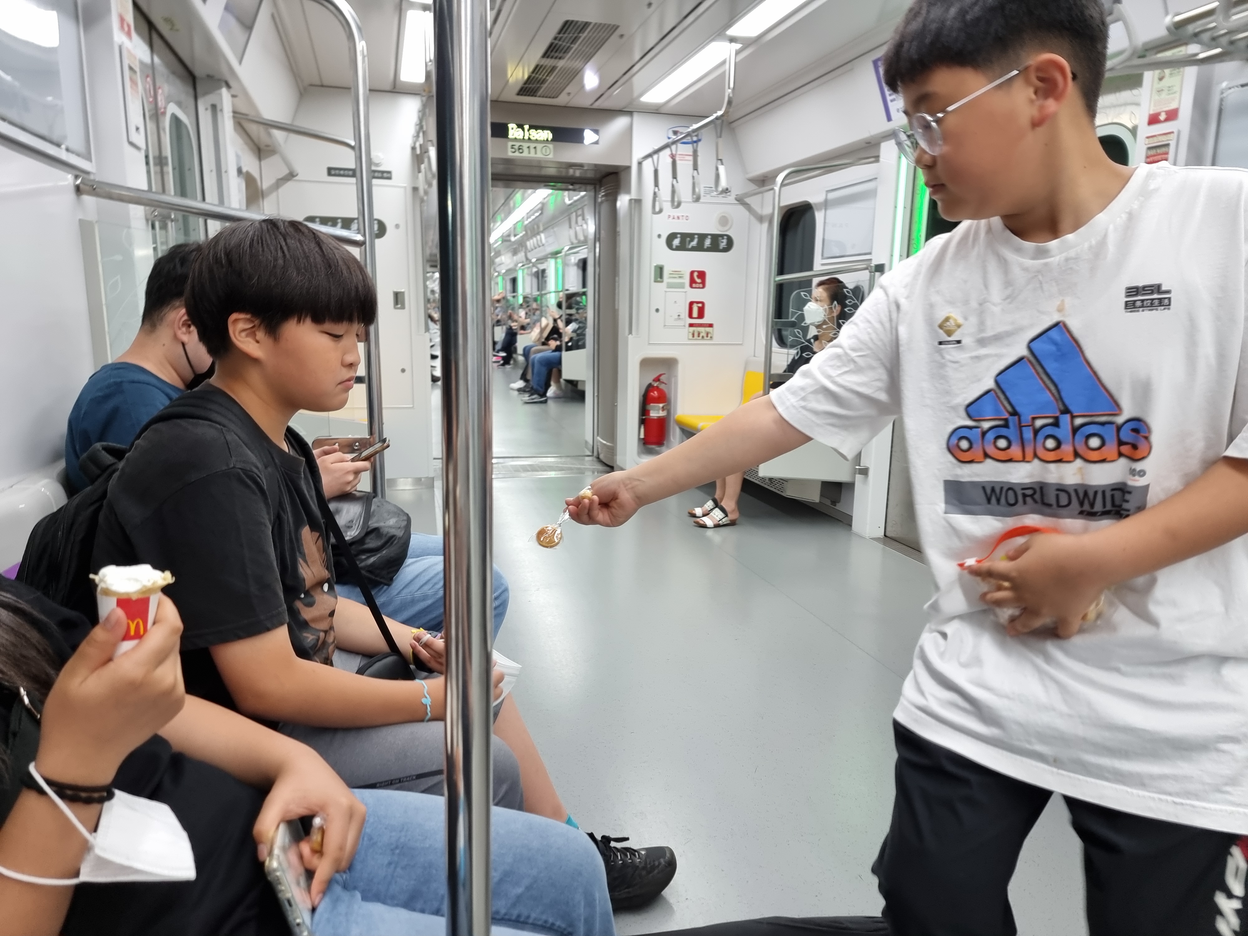 지하철에서 서로 가져온 간식을 나누어 먹었습니다.
