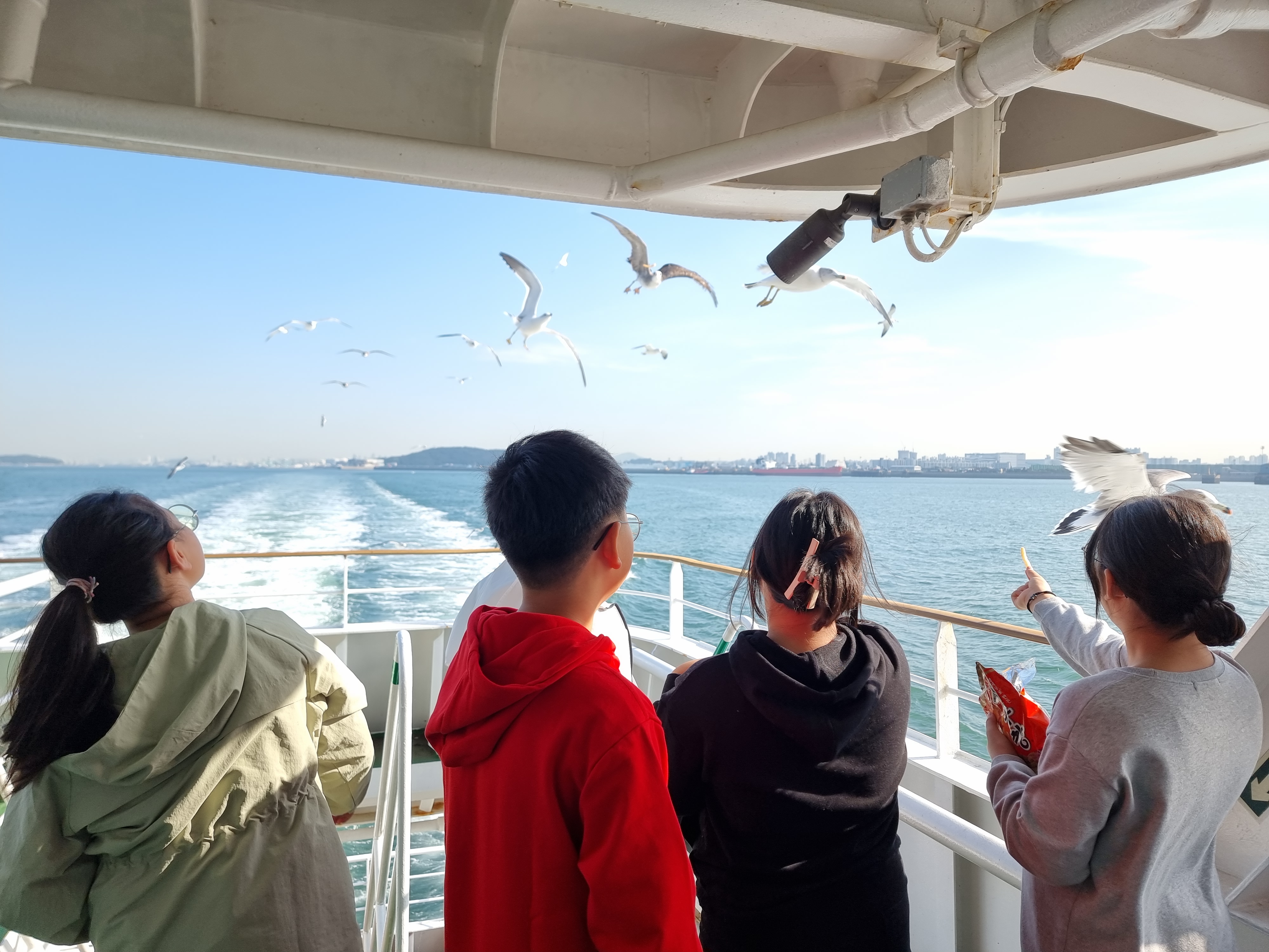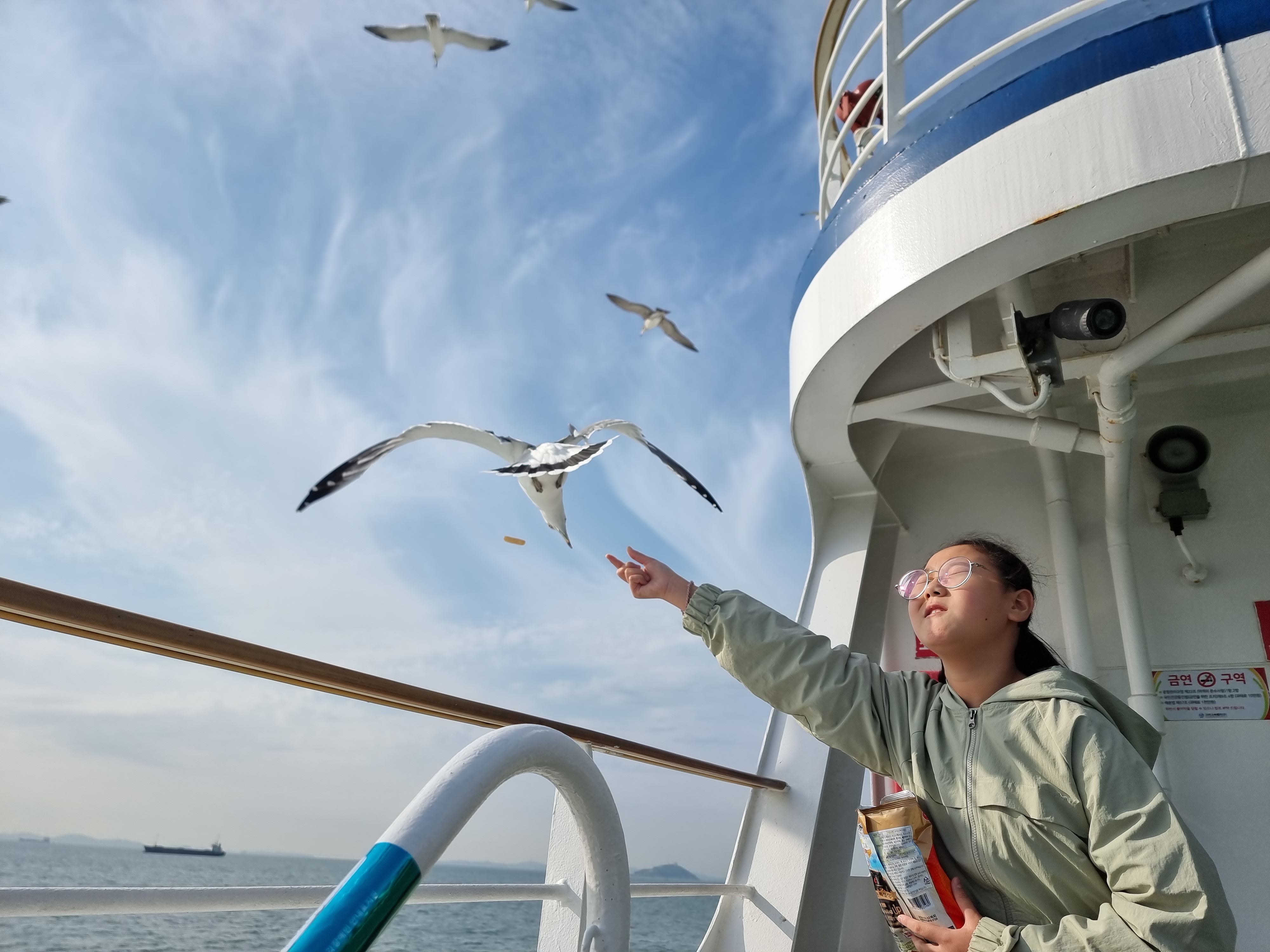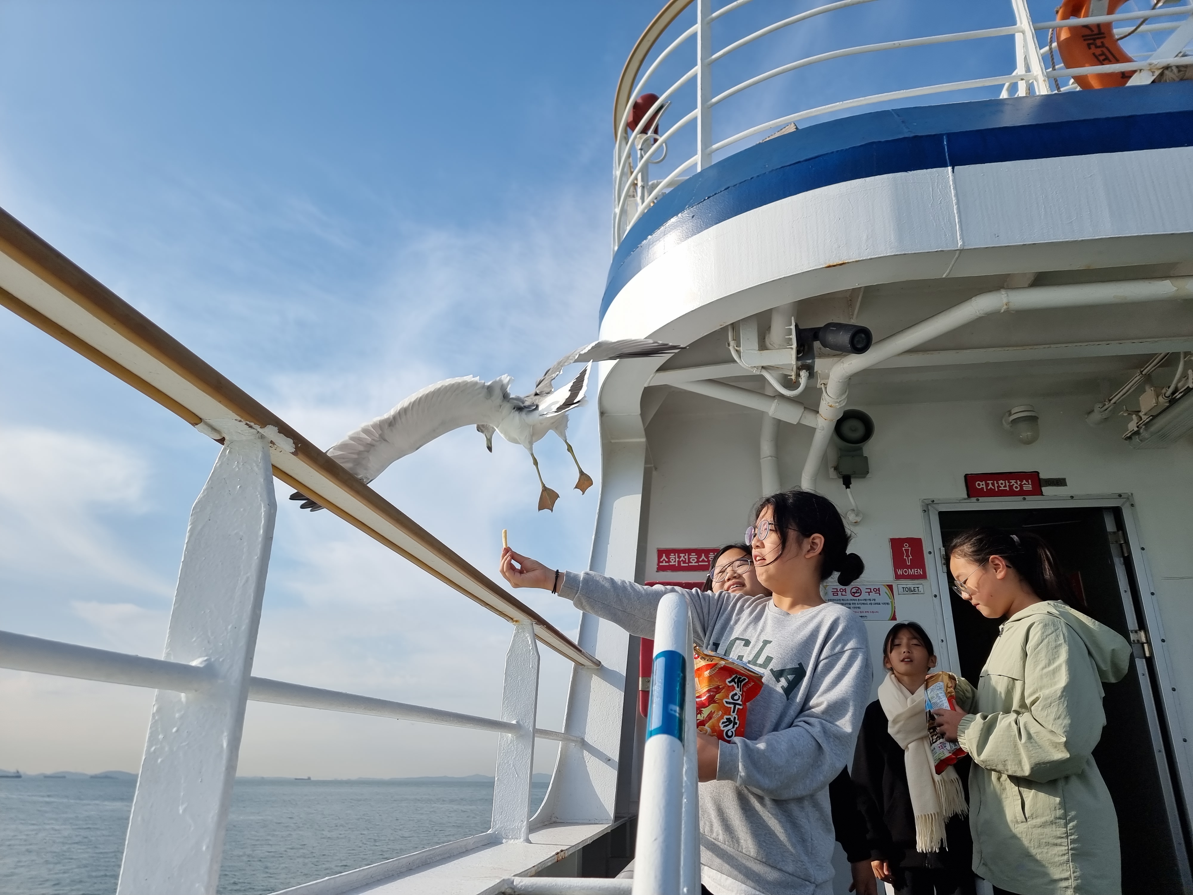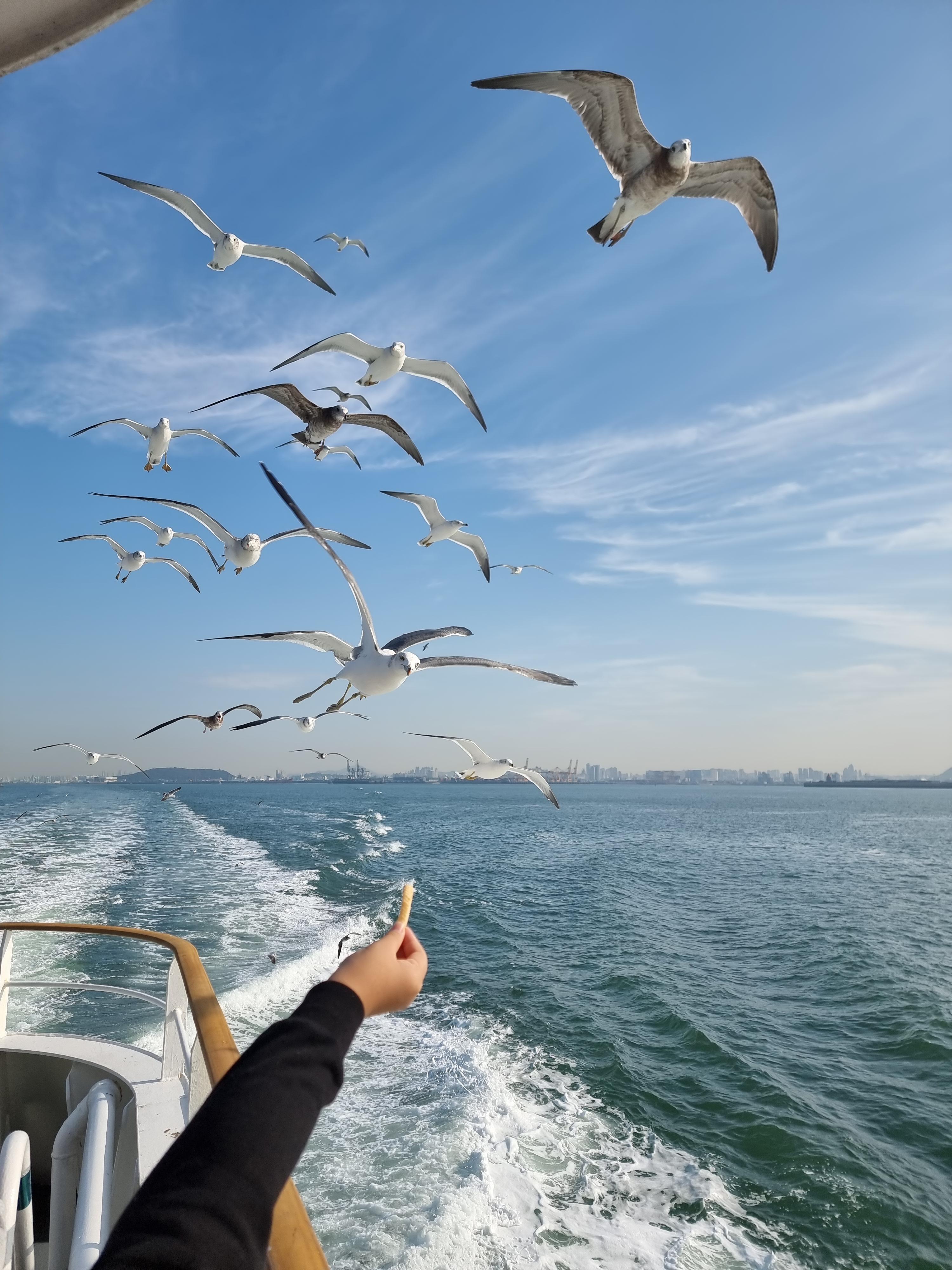 배를 타면 빼놓을 수 없는 건 갈매기에 새우깡을 주는 겁니다.