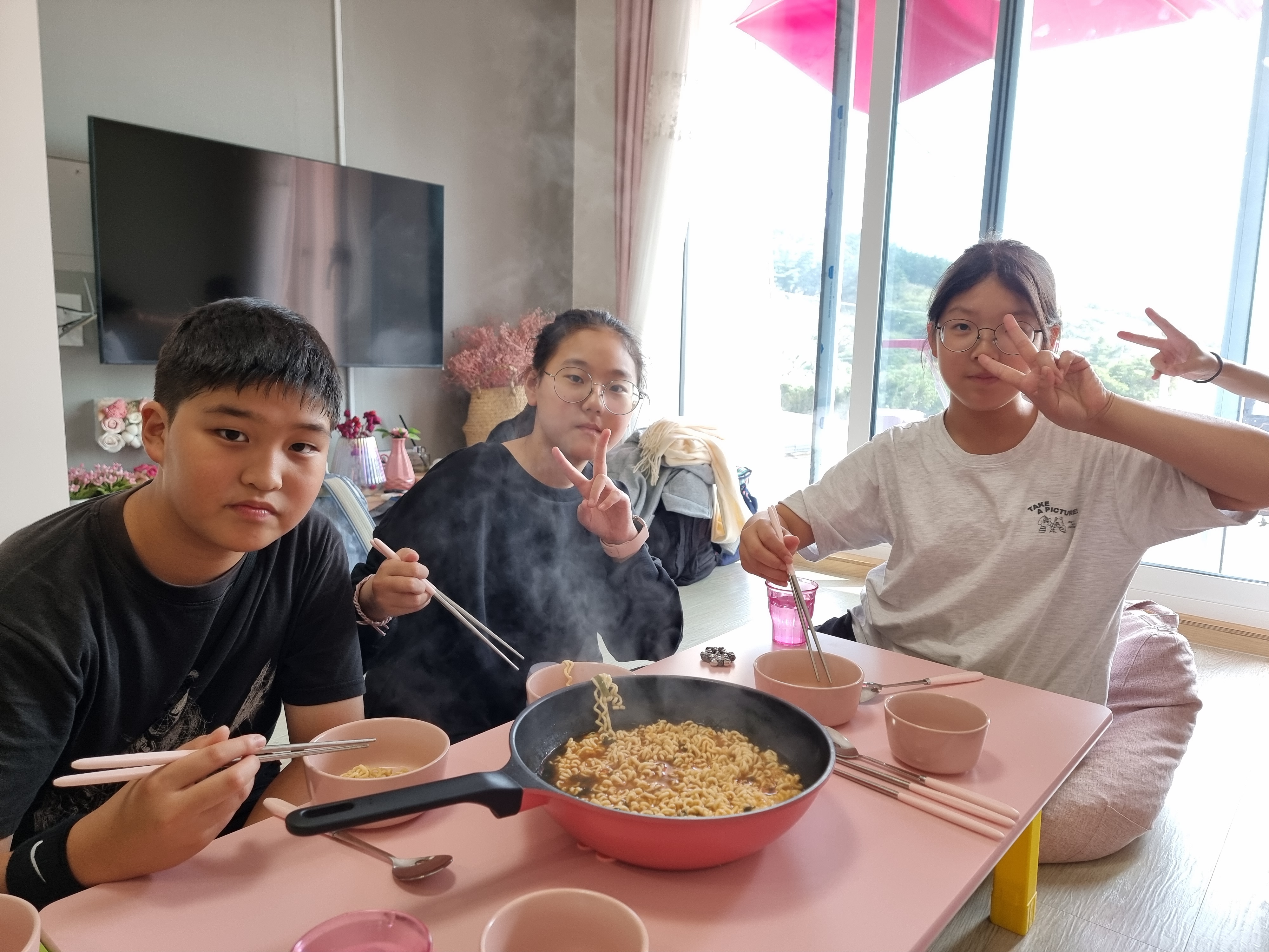 우형이와 용성리가 라면을 끓였습니다.